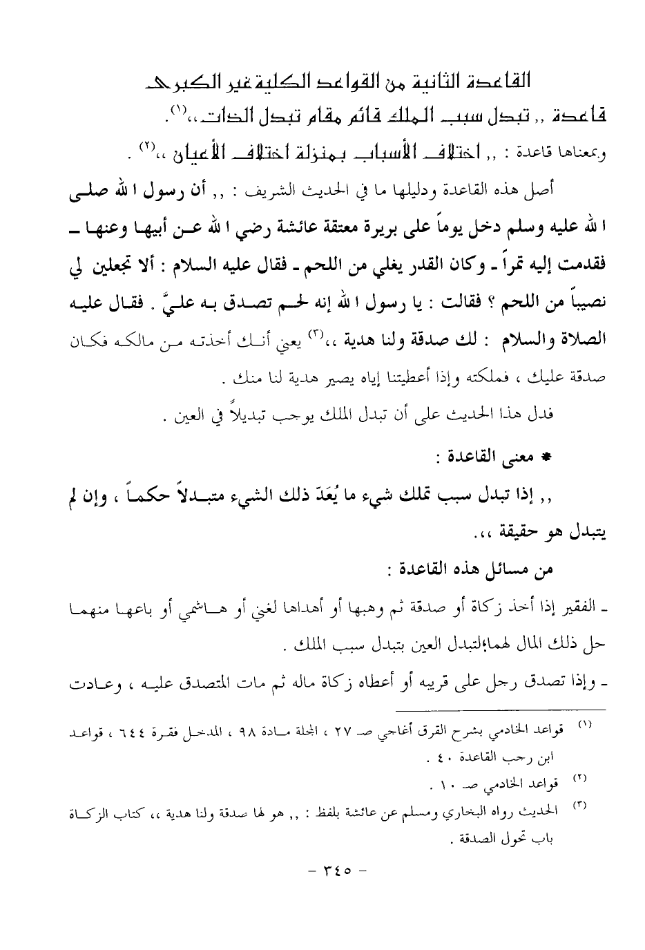 (إذا تبدل سبب تملك شيء ما يُعَدّ ذلك الشيء متبدلاً حكماً، وإن لم يتبدل هو حقيقة) .