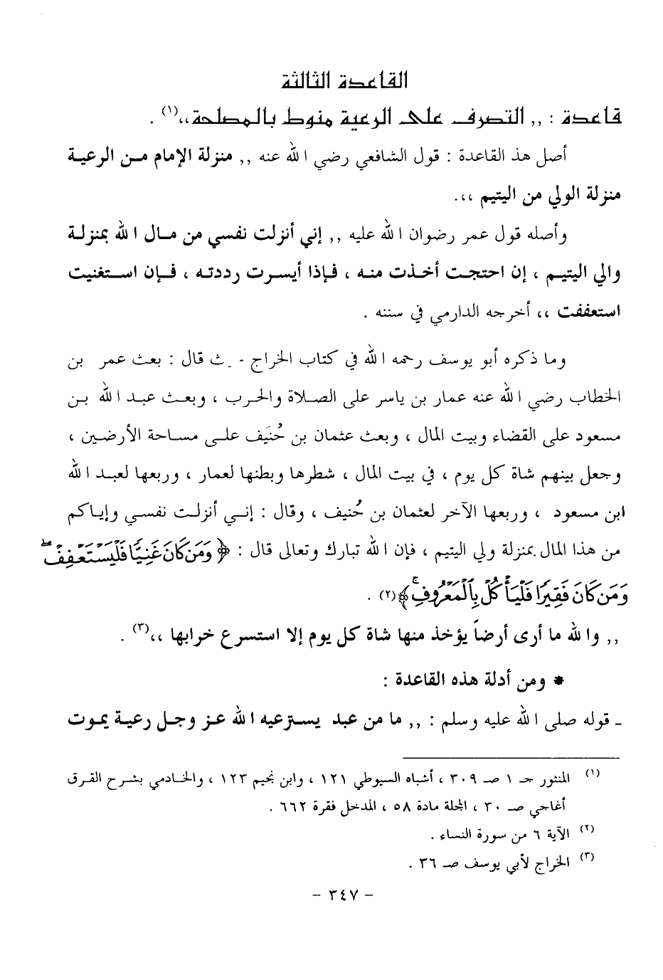وما ذكره أبو يوسف رحمه الله في كتاب الخراج حيث قال: بعث عمر بن الخطاب رضي الله عنه عمار بن ياسر على الصلاة والحرب، وبعث عبد الله بن مسعود على القضاء وبيت المال، وبعث عثمان بن حُنيف على مساحة الأرضين، وجعل بينهم شاة كل يوم، في بيت المال، شطرها وبطنها لعمار، وربعها لعبد الله بن مسعود، وربعها الآخر لعثمان بن حنيف، وقال: إني أنزلت نفسي وإياكم من هذا المال بمنزلة ولي اليتيم، فإن الله تبارك وتعالى قال: (ومَن كان غنياً فليستعفف ومن كان فقيراً فليأكل بالمعروف) . سورة النساء، آية (٦) .