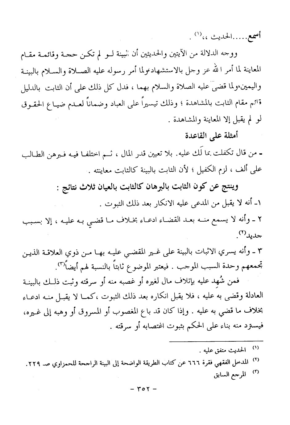 ووجه الدلالة من الآيتين والحديثين أن البينة لو لم تكن حجة وقائمة مقام المعاينة لما أمر الله عز وجل بالاستشهاد، ولما أمر رسوله عليه الصلاة والسلام بالبينة واليمين، ولما قضى عليه الصلاة والسلام بهما، فدل كل ذلك على أن الثابت بالدليل قائم مقام الثابت بالمشاهدة؛ وذلك تيسيراً على العباد وضماناً لعدم ضياع الحقوق لو لم يقبل إلا المعاينة والمشاهدة.