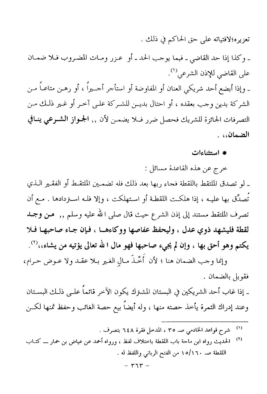 وإذا أبضع أحد شريكي العنان أو المفاوضة أو استأجر أجيراً، أو رهن متاعاً من الشركة بدين وجب بعقده، أو احتال بدين للشركة على آخر أو غير ذلك من التصرفات الجائزة للشريك فحصل ضرر فلا يضمن لأن (الجواز الشرعي ينافي الضمان) .