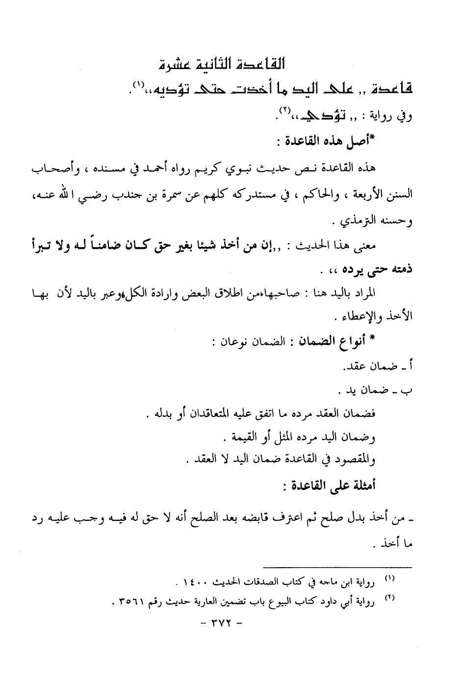 هذه القاعدة نص حديث نبوي كريم رواه أحمد في مسنده، وأصحاب السنن الأربعة، والحاكم، في مستدركه كلهم عن سمرة بن جندب رضي الله عنه، وحسنه الترمذي.