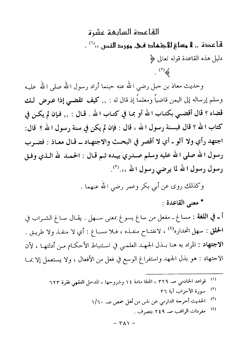 وحديث معاذ بن جبل رضي الله عنه حينما أراد رسول الله صلى الله عليه وسلم إرساله إلى اليمن قاضياً ومعلماً إذ قال له: (كيف تقضي إذا عرض لك قضاء؟ قال أقضي بكتاب الله أو بما في كتاب الله. قال: (فإن لم يكن في كتاب الله؟ قال فبسنة رسول الله، قال: فإن لم يكن في سنة رسول الله؟ قال: اجتهد رأي ولا آلو، أي لا أقصر في البحث والاجتهاد. قال معاذ: فضرب رسول الله صلى الله عليه وسلم صدري بيده ثم قال: الحمد لله الذي وفق رسول رسول الله لما يرضي رسول الله) .