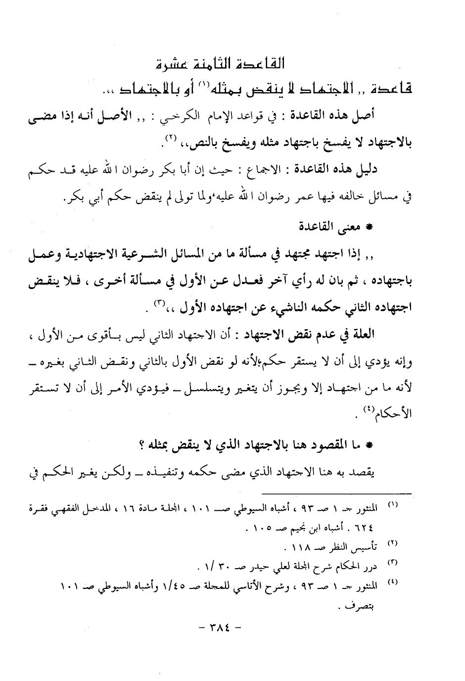 (إذا اجتهد مجتهد في مسألة ما من المسائل الشرعية الاجتهادية وعمل باجتهاده، ثم بان له رأي آخر فعدل عن الأول في مسألة أخرى، فلا ينقض اجتهاده الثاني حكمه الناشئ عن اجتهاده الأول) .