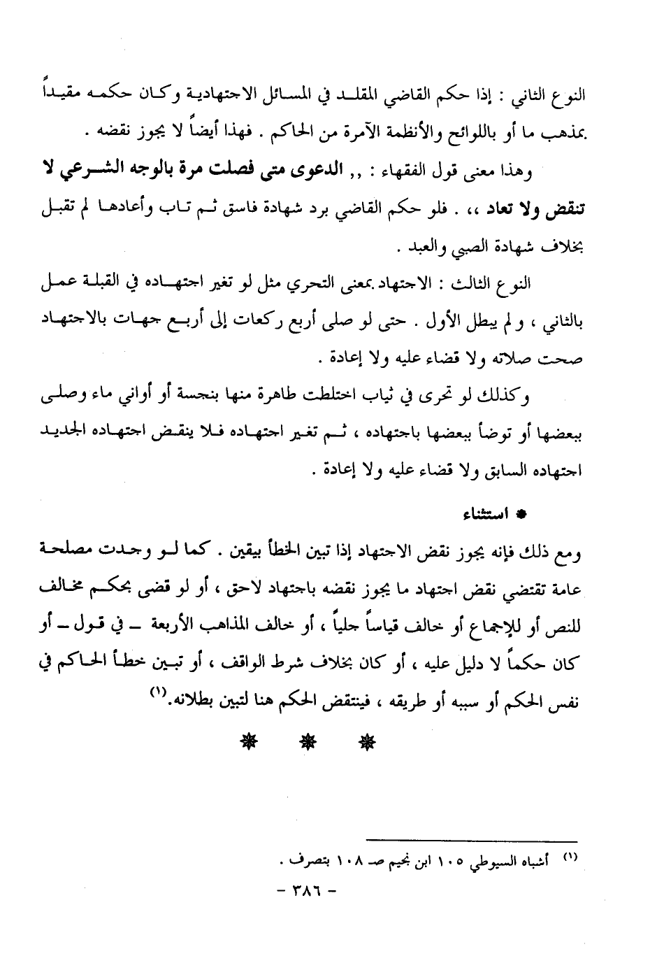 ومع ذلك فإنه يجوز نقض الاجتهاد إذا تبين الخطأ بيقين، كما لو وجدت مصلحة عامة تقتضي نقض اجتهاد ما يجوز نقضه باجتهاد لاحق، أو لو قضى بحكم مخالف للنص أو للإجماع أو خالف قياساً جلياً، أو خالف المذاهب الأربعة، في قول أو كان حكماً لا دليل عليه، أو كان بخلاف شرط الواقف، أو تبين خطأ الحاكم في نفس الحكم أو سببه أو طريقه، فينتقض الحكم هنا لتبين بطلانه.