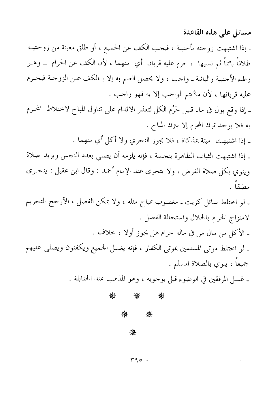 إذا اشتبهت زوجته بأجنبية، فيجب الكف عن الجميع، أو طلق معينة من زوجتيه طلاقا بائناً ثم نسيها، حرم عليه قربان أي منهما، لأن الكف عن الحرام، وهو وطء الأجنبية والبائنة واجب، ولا يحصل العلم به إلا بالكف عن الزوجة فيحرم عليه قربانها، لأن ما يتم الواجب إلا به فهو واجب.
