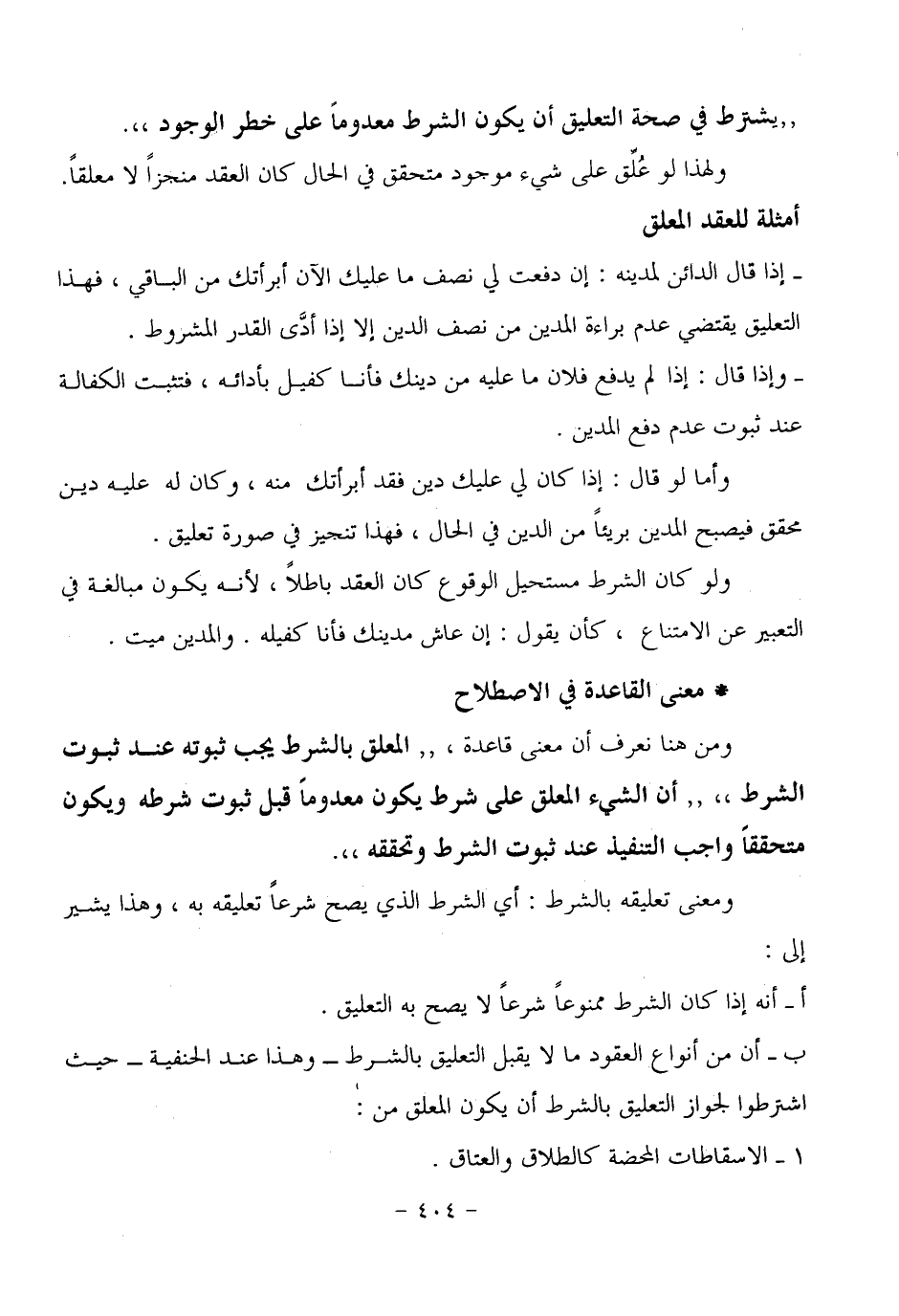 ومن هنا نعرف أن معنى قاعدة: (المعلق بالشرط يجب ثبوته عند ثبوت الشرط) . أن الشيء المعلق على شرط يكون معدوماً قبل ثبوت شرطه ويكون متحققاً واجب التنفيذ عند ثبوت الشرط وتحققه) .