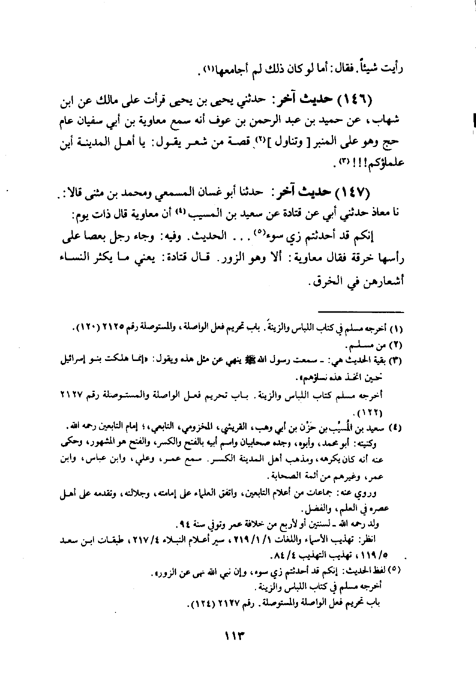 146 - حَدِيث آخر حَدثنِي يحيى بن يحيى قَرَأت على مَالك عَن ابْن شهَاب عَن حميد بن عبد الرَّحْمَن بن عَوْف أَنه سمع مُعَاوِيَة بن أبي سُفْيَان عَام حج وَهُوَ على الْمِنْبَر وَتَنَاول قصَّة من شعر يَقُول يَا أهل الْمَدِينَة أَيْن عُلَمَاؤُكُمْ