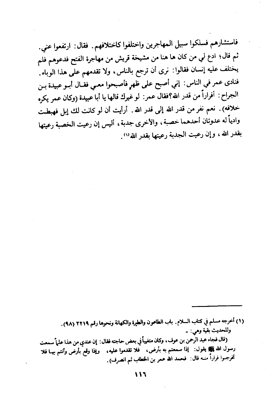 فاستشارهم فسلكوا سَبِيل الْمُهَاجِرين وَاخْتلفُوا كاختلافهم فَقَالَ ارتفعوا عني ثمَّ قَالَ ادْع لي من كَانَ هَا هُنَا من مشيخة قُرَيْش من مهاجرة الْفَتْح فدعوهم فَلم يخْتَلف عَلَيْهِ إِنْسَان فَقَالُوا نرى أَن ترجع بِالنَّاسِ وَلَا تقدمهم على هَذَا الوباء فَنَادَى عمر فِي النَّاس إِنِّي أصبح على ظهر فَأَصْبحُوا معي فَقَالَ أَبُو عُبَيْدَة بن الْجراح أفرار من قدر الله فَقَالَ عمر لَو غَيْرك قَالَهَا يَا أَبَا عُبَيْدَة وَكَانَ عمر يكره خلَافَة نعم نفر من قدر الله الى قدر الله أَرَأَيْت أَن لَو كَانَت لَك إبل فَهَبَطت وَاديا لَهُ عدوتان أَحدهمَا خصبة والخر جدبة أَلَيْسَ إِن رعيت الخصبة رعيتها بِقدر الله وَإِن رعيت الجدبة رعيتها بِقدر الله