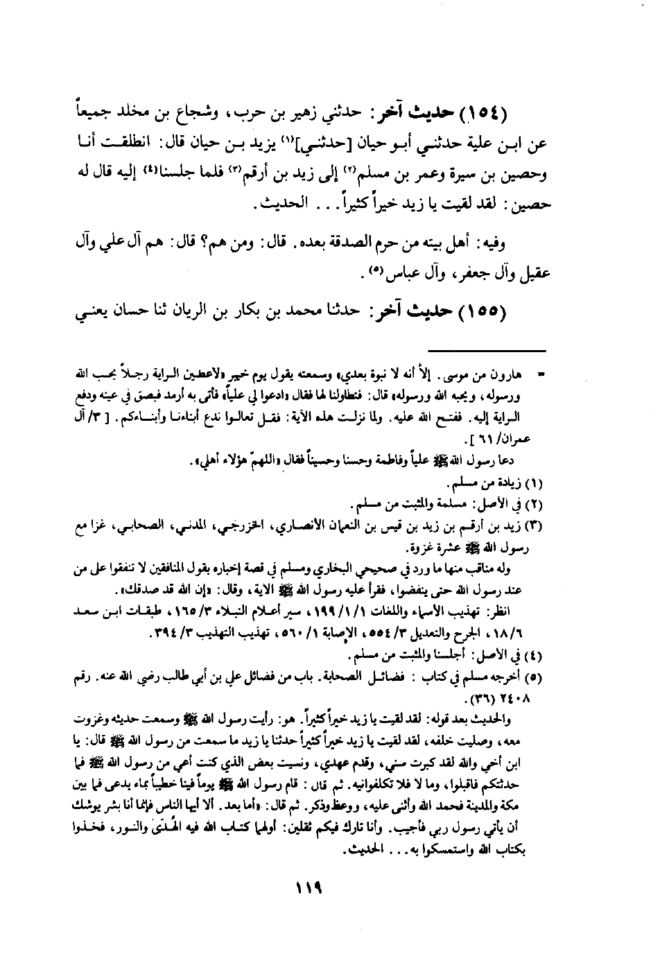 154 - حَدِيث آخر حَدثنِي زُهَيْر بن حَرْب وشجاع بن مخلد جَمِيعًا عَن ابْن عَلَيْهِ حَدثنِي أَبُو حَيَّان حَدثنِي يزِيد بن حَيَّان قَالَ انْطَلَقت أَنا وحصين بن سيرة وَعمر بن مُسلم إِلَى زيد بن أَرقم فَلَمَّا جلسنا إِلَيْهِ قَالَ لَهُ حُصَيْن لقد لقِيت يَا زيد خيرا كثيرا الحَدِيث