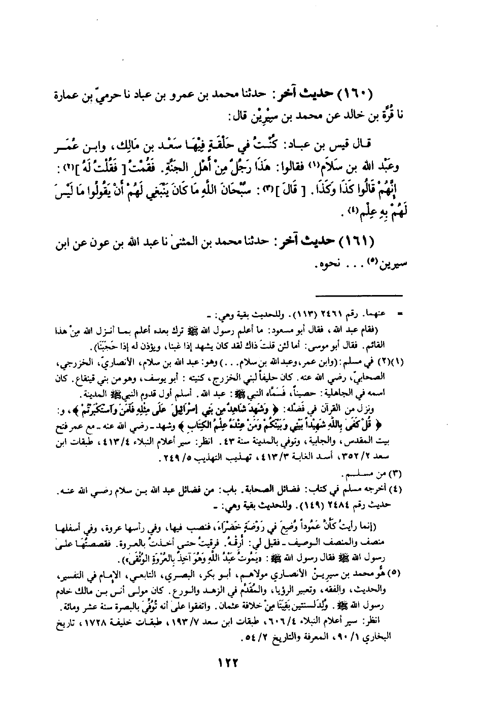 160 - حَدِيث آخر حَدثنَا مُحَمَّد بن عَمْرو بن عباد نَا حرمي بن عمَارَة نَا قُرَّة بن خَالِد عَن مُحَمَّد بن سِيرِين قَالَ قَالَ قيس بن عباد كنت فِي حَلقَة فِيهَا سعد بن مَالك وَابْن عمر وَعبد الله بن سَلام فَقَالُوا هَذَا رجل من أهل الْجنَّة فَقُمْت فَقلت لَهُ إِنَّهُم قَالُوا كَذَا وَكَذَا قَالَ سُبْحَانَ الله مَا كَانَ يَنْبَغِي لَهُم أَن يَقُولُوا مَا لَيْسَ لَهُم بِهِ علم