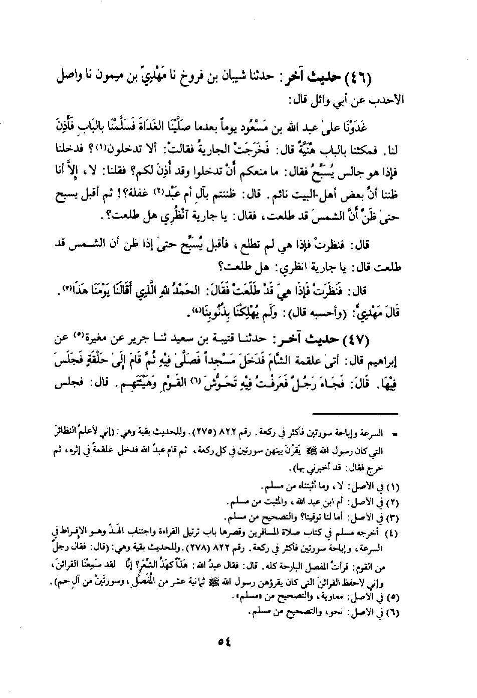 غدونا على عبد الله بن مَسْعُود يَوْمًا بَعْدَمَا صلينَا الْغَدَاة فسلمنا بِالْبَابِ فَأذن لنا فَمَكثْنَا بِالْبَابِ هنيَّة قَالَ فَخرجت الْجَارِيَة فَقَالَت أَلا تدخلون فَدَخَلْنَا فاذا هُوَ جَالس يسبح فَقَالَ مَا منعكم أَن تدْخلُوا وَقد أذن لكم فَقُلْنَا لَا الا أَنا ظننا أَن بعض أهل الْبَيْت نَائِم قَالَ ظننتم بآل أم عبد غَفلَة ثمَّ أقبل يسبح حَتَّى ظن أَن الشَّمْس قد طلعت فَقَالَ يَا جَارِيَة أنظري هَل طلعت