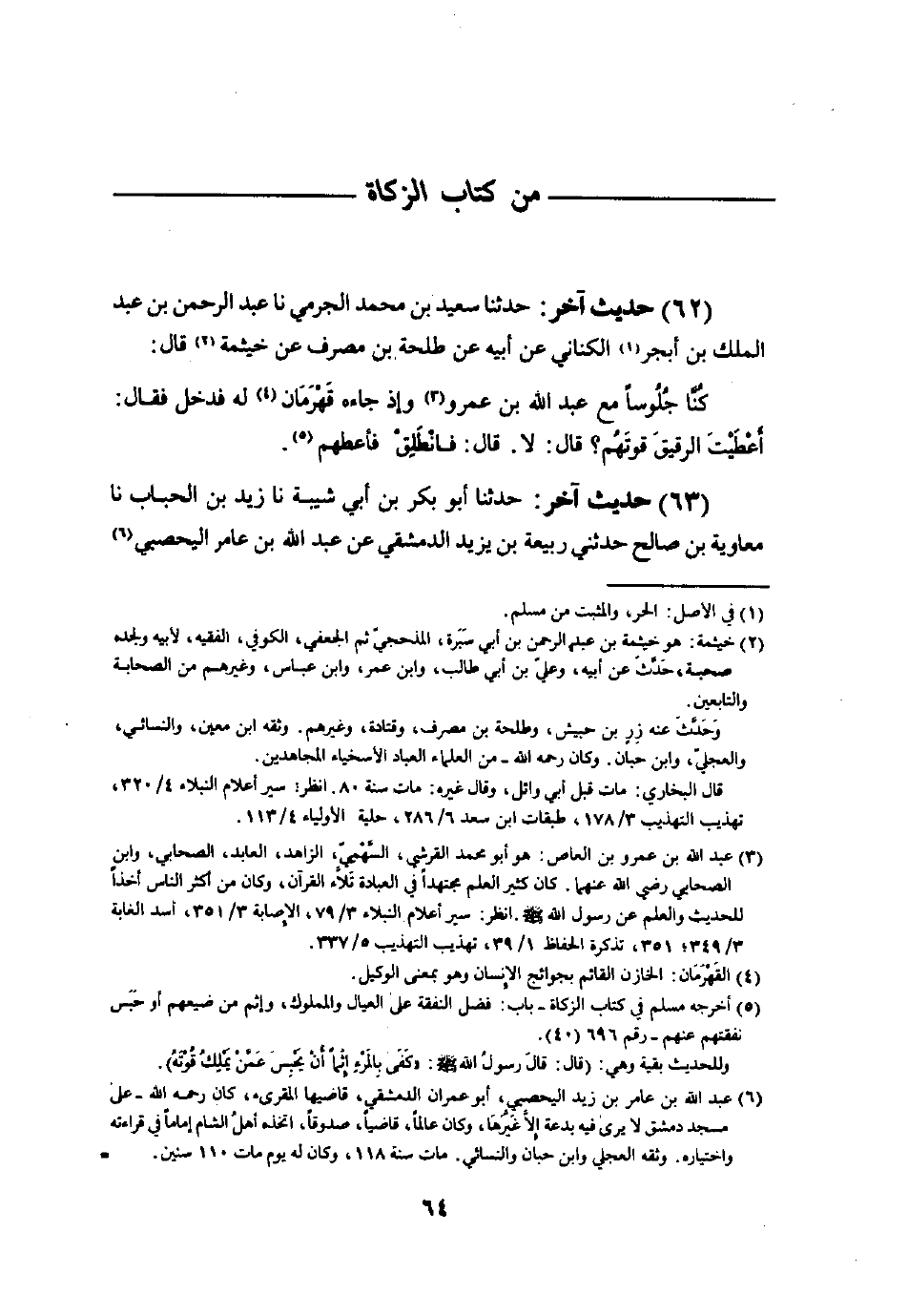 62 - حَدِيث آخر حَدثنَا سعيد بن مُحَمَّد الْجرْمِي نَا عبد الرَّحْمَن بن عبد الْملك بن أبجر الْكِنَانِي عَن أَبِيه عَن طَلْحَة بن مصرف عَن خَيْثَمَة قَالَ