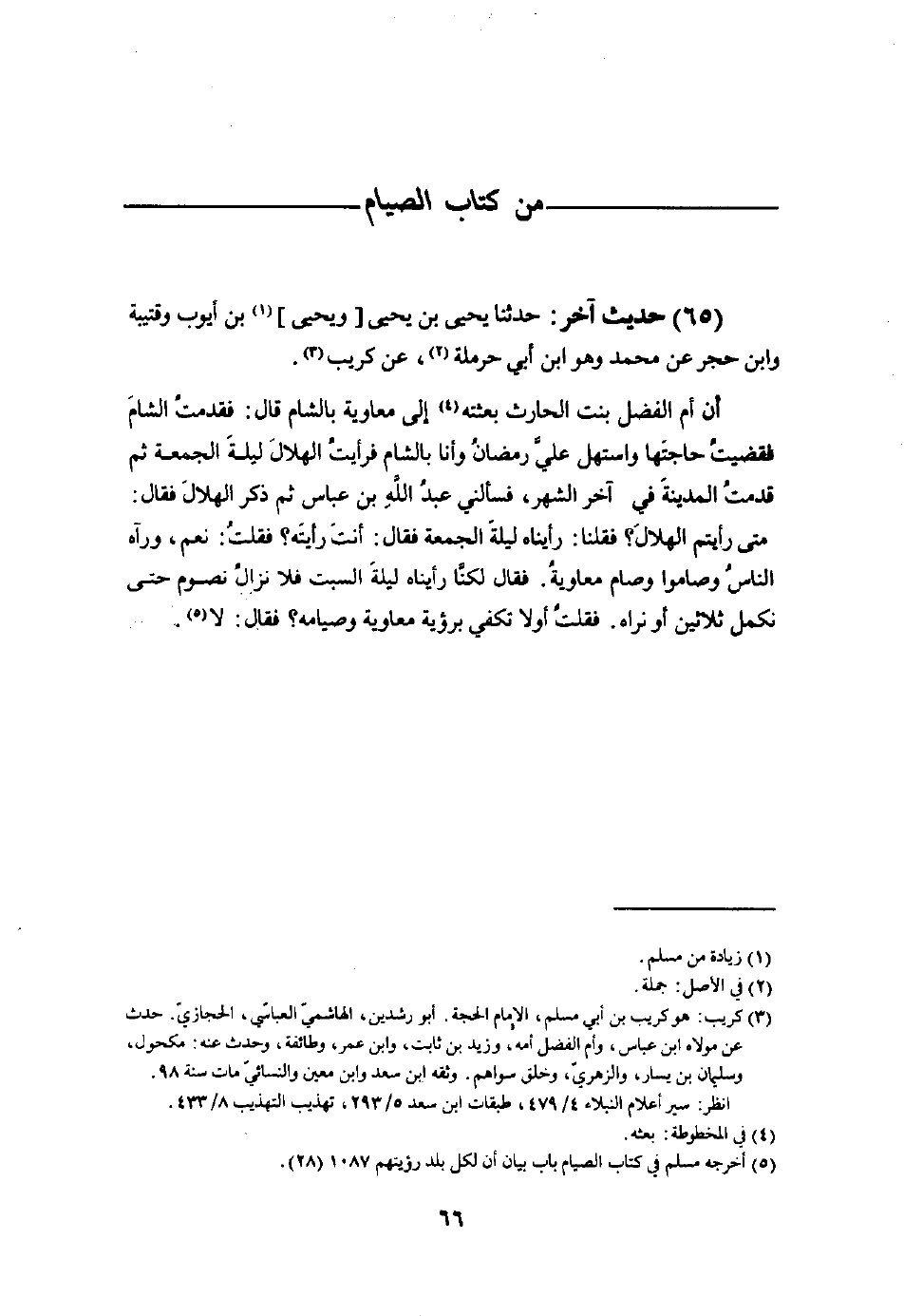 65 - حَدِيث آخر حَدثنَا يحيى بن يحيى وَيحيى بن أَيُّوب وقتيبة وَابْن حجر عَن مُحَمَّد وَهُوَ ابْن أبي حَرْمَلَة عَن كريب