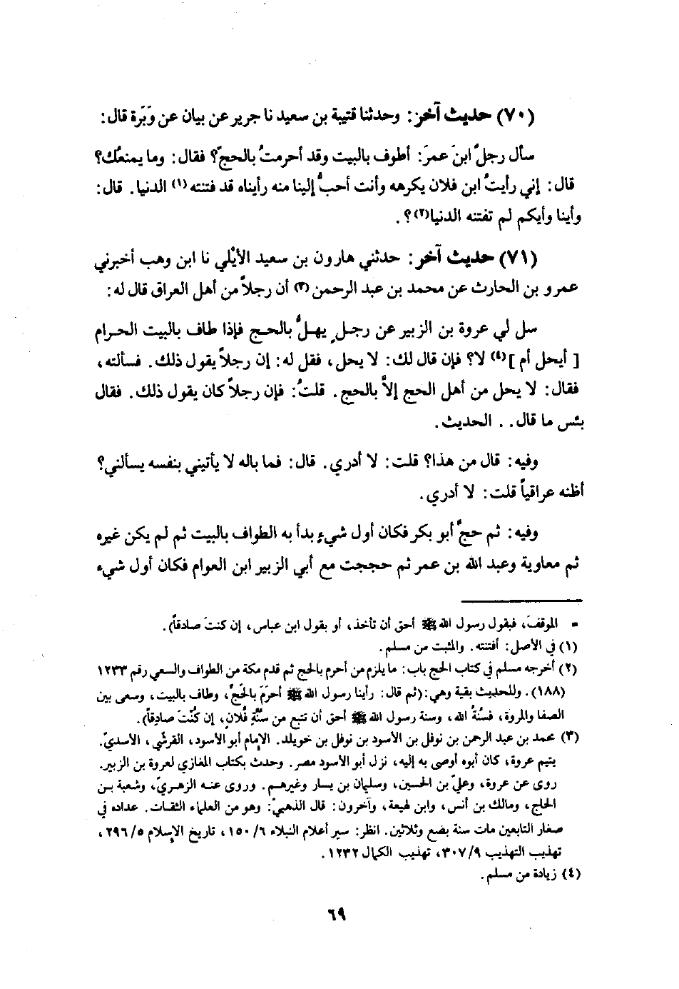 سل لي عُرْوَة بن الزبير عَن رجل يهل بِالْحَجِّ فاذا طَاف بِالْبَيْتِ الْحَرَام أَيحلُّ أم لَا فَإِن قَالَ لَك لَا يحل فَقل لَهُ أَن رجلا يَقُول ذَلِك فَسَأَلته فَقَالَ لَا يحل من أهل الْحَج إِلَّا بِالْحَجِّ قلت فان رجلا كَانَ يَقُول ذَلِك فَقَالَ بئس مَا قَالَ الحَدِيث