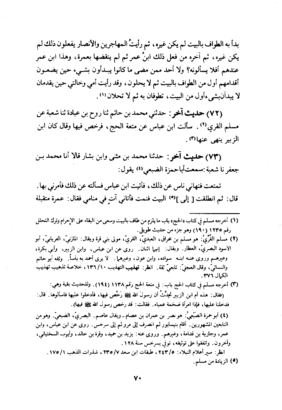 72 - حَدِيث آخر حَدثنِي مُحَمَّد بن حَاتِم ثَنَا روح بن عبَادَة ثَنَا شُعْبَة عَن مُسلم القري سَأَلت ابْن عَبَّاس عَن مُتْعَة الْحَج فَرخص فِيهَا وَقَالَ كَانَ ابْن الزبير ينْهَى عَنْهَا