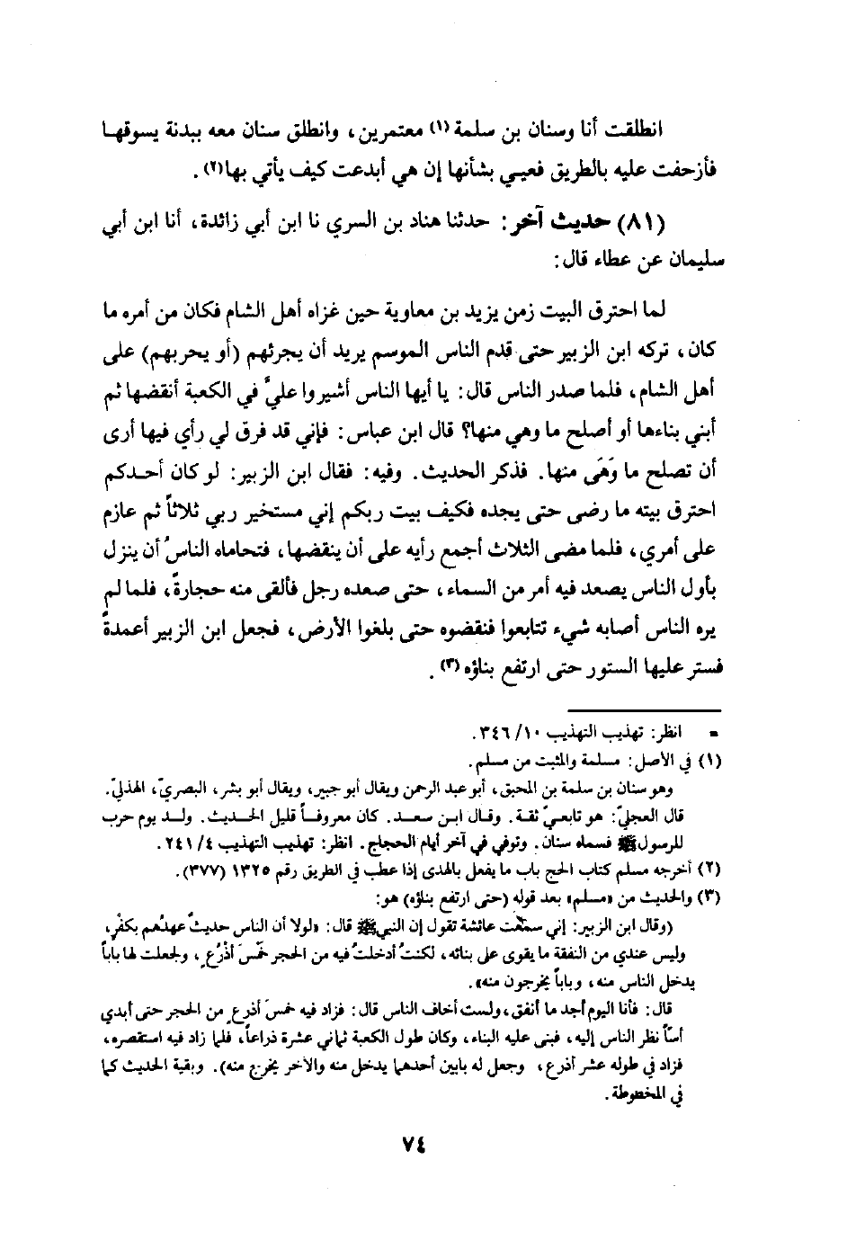 81 - حَدِيث آخر حَدثنَا هناد بن السّري نَا ابْن أبي زَائِدَة أَنا ابْن أبي سُلَيْمَان عَن عَطاء قَالَ لما احْتَرَقَ الْبَيْت زمن يزِيد بن مُعَاوِيَة حِين غزاه أهل الشَّام فَكَانَ من أمره مَا كَانَ تَركه ابْن الزبير حَتَّى قدم النَّاس الْمَوْسِم يُرِيد أَن يجرئهم أَو يحربهم على أهل الشَّام فَلَمَّا صدر النَّاس قَالَ يَا أَيهَا النَّاس أَشِيرُوا عَليّ فِي الْكَعْبَة أنقضها ثمَّ أبني بنائها أَو أصلح مَا وَهِي مِنْهَا قَالَ ابْن عَبَّاس فَإِنِّي قد فرق لي رَأْي فِيهَا أرى أَن تصلح مَا وَهِي مِنْهَا فَذكر الحَدِيث وَفِيه فَقَالَ ابْن الزبير لَو كَانَ أحدكُم احْتَرَقَ بَيته مَا رضى حَتَّى يجده فَكيف بَيت ربكُم إِنِّي مستخير رَبِّي ثَلَاثًا ثمَّ عازم على أَمْرِي فَلَمَّا مضى الثَّلَاث أجمع رَأْيه على أَن ينقضها فتحاماه النَّاس أَن ينزل بِأول النَّاس يصعد فِيهِ أَمر من السَّمَاء حَتَّى صعده رجل فَألْقى مِنْهُ حِجَارَة فَلَمَّا لم يره النَّاس أَصَابَهُ شَيْء تتابعوا فنقضوه حَتَّى بلغُوا الأَرْض فَجعل ابْن الزبير أعمدة فَستر عَلَيْهَا الستور حَتَّى ارْتَفع بِنَاؤُه