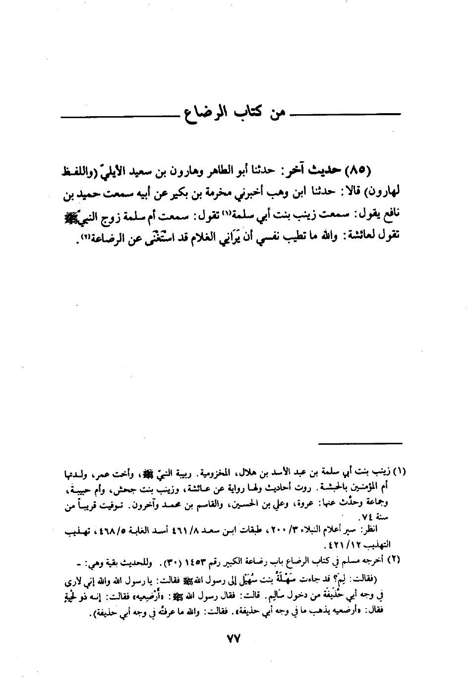 85 - حَدِيث آخر حَدثنَا أَبُو الطَّاهِر وَهَارُون بن سعيد الْأَيْلِي وَاللَّفْظ لهارون قَالَا حَدثنَا ابْن وهب أَخْبرنِي مخرمَة بن بكير عَن أَبِيه سَمِعت حميد بن نَافِع يَقُول سَمِعت زَيْنَب بنت أبي سَلمَة تَقول سَمِعت أم سَلمَة زوج النَّبِي صلى الله عَلَيْهِ وَسلم تَقول لعَائِشَة وَالله مَا تطيب نَفسِي أَن يراني الْغُلَام قد اسْتغنى عَن الرضَاعَة