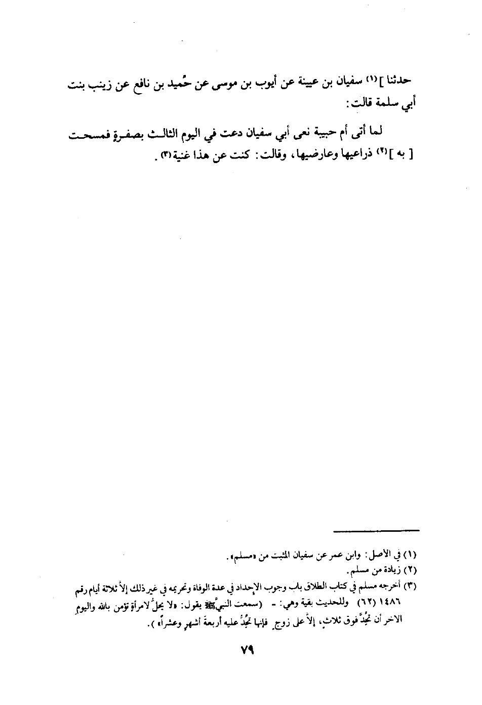حَدثنَا سُفْيَان بن عُيَيْنَة عَن أَيُّوب بن مُوسَى عَن حميد بن نَافِع عَن زَيْنَب بنت أبي سَلمَة قَالَت لما أَتَى أم حَبِيبَة نعى أبي سُفْيَان دعت فِي الْيَوْم الثَّالِث بصفرة فمسحت بِهِ ذراعيها وعارضيها وَقَالَت كنت عَن هَذَا غنية