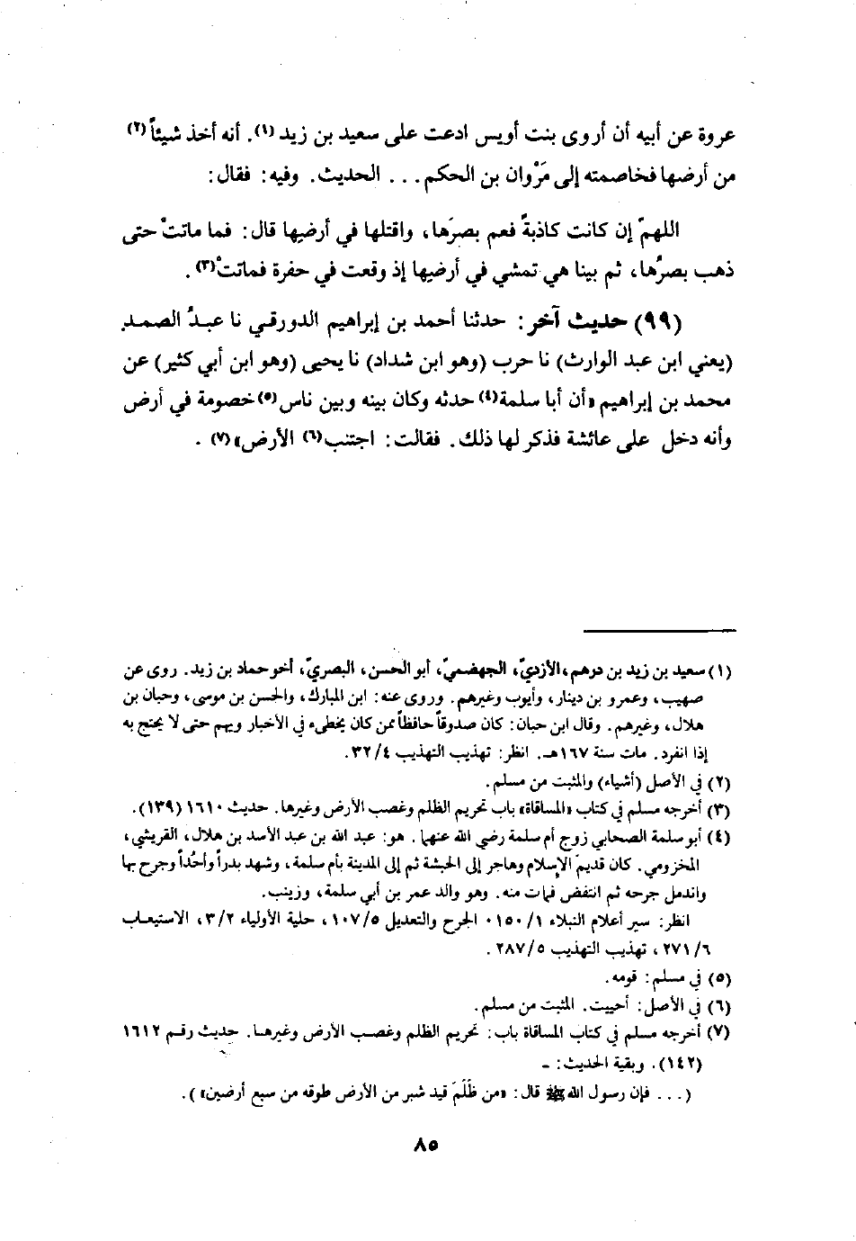 99 - حَدِيث آخر حَدثنَا أَحْمد بن ابراهيم الدَّوْرَقِي نَا عبد الصَّمد يَعْنِي ابْن عبد الوراث نَا حَرْب وَهُوَ ابْن شَدَّاد نَا يحيى وَهُوَ ابْن أبي كثير عَن مُحَمَّد بن ابراهيم أَنا أَبَا سَلمَة حدثة وَكَانَ بَينه وَبَين نَاس خُصُومَة فِي أَرض وَأَنه دخل على عَائِشَة فَذكر لَهَا ذَلِك فَقَالَت اجْتنب الأَرْض
