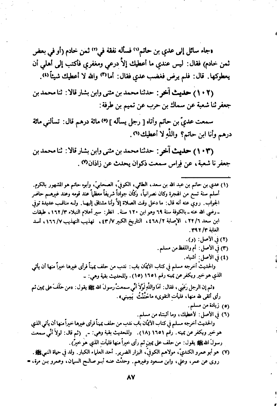سَمِعت عدي بن حَاتِم وَأَتَاهُ رجل يسْأَله مائَة دِرْهَم قَالَ تَسْأَلنِي مائَة دِرْهَم وَأَنا ابْن حَاتِم وَالله لَا أُعْطِيك