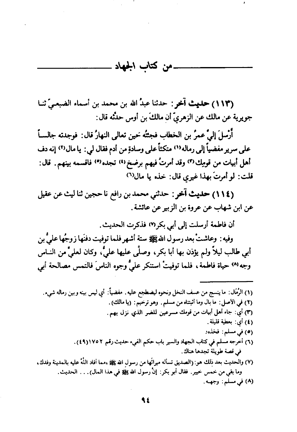 113 - حَدِيث آخر حَدثنَا عبد الله بن مُحَمَّد بن أَسمَاء الضبعِي ثَنَا جوَيْرِية عَن مَالك عَن الزُّهْرِيّ أَن مَالك بن أَوْس حَدثهُ قَالَ أرسل إِلَيّ عمر بن الْخطاب فَجِئْته حِين تَعَالَى النَّهَار قَالَ فَوَجَدته جَالِسا على سَرِير مفضيا الى رماله مُتكئا على وسَادَة من أَدَم فَقَالَ لي يَا مَال أَنه دف أهل أَبْيَات من قَوْمك وَقد أمرت فيهم برضخ تَجدهُ فاقسمه بَينهم قَالَ قلت لَو أمرت بِهَذَا غَيْرِي قَالَ خُذْهُ يَا مَال