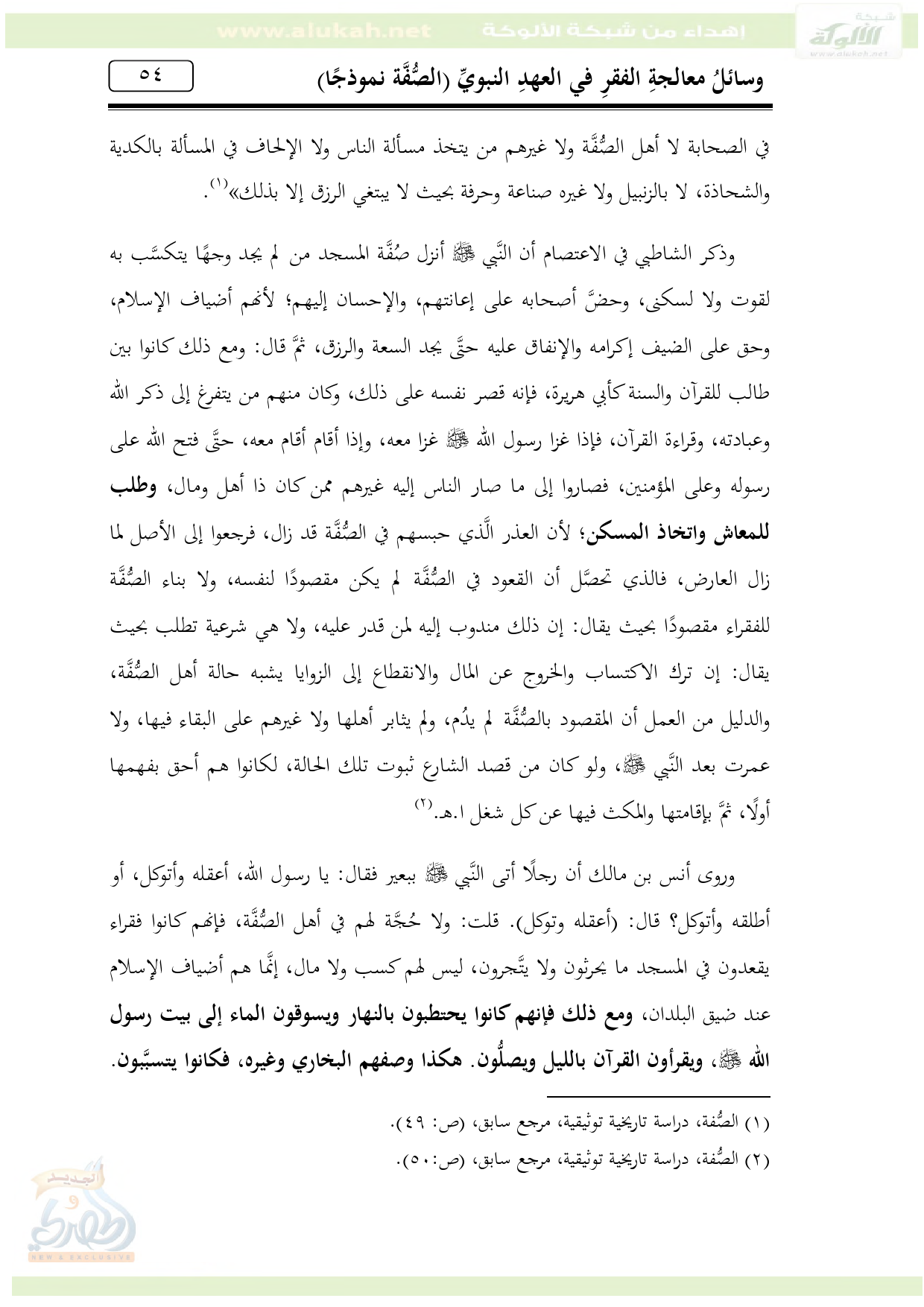 وذكر الشاطبي في الاعتصام أن النَّبي - صلى الله عليه وسلم - أنزل صُفَّة المسجد من لم يجد وجهًا يتكسَّب به لقوت ولا لسكنى، وحضَّ أصحابه على إعانتهم، والإحسان إليهم؛ لأنهم أضياف الإسلام، وحق على الضيف إكرامه والإنفاق عليه حتَّى يجد السعة والرزق، ثمَّ قال: ومع ذلك كانوا بين طالب للقرآن والسنة كأبي هريرة، فإنه قصر نفسه على ذلك، وكان منهم من يتفرغ إلى ذكر الله وعبادته، وقراءة القرآن، فإذا غزا رسول الله - صلى الله عليه وسلم - غزا معه، وإذا أقام أقام معه، حتَّى فتح الله على رسوله وعلى المؤمنين، فصاروا إلى ما صار الناس إليه غيرهم ممن كان ذا أهل ومال، وطلب للمعاش واتخاذ المسكن؛ لأن العذر الَّذي حبسهم في الصُّفَّة قد زال، فرجعوا إلى الأصل لما زال العارض، فالذي تحصَّل أن القعود في الصُّفَّة لم يكن مقصودًا لنفسه، ولا بناء الصُّفَّة للفقراء مقصودًا بحيث يقال: إن ذلك مندوب إليه لمن قدر عليه، ولا هي شرعية تطلب بحيث يقال: إن ترك الاكتساب والخروج عن المال والانقطاع إلى الزوايا يشبه حالة أهل الصُّفَّة، والدليل من العمل أن المقصود بالصُّفَّة لم يدُم، ولم يثابر أهلها ولا غيرهم على البقاء فيها، ولا عمرت بعد النَّبي - صلى الله عليه وسلم -، ولو كان من قصد الشارع ثبوت تلك الحالة، لكانوا هم أحق بفهمها أولًا، ثمَّ بإقامتها والمكث فيها عن كل شغل ا. هـ. (¬2)