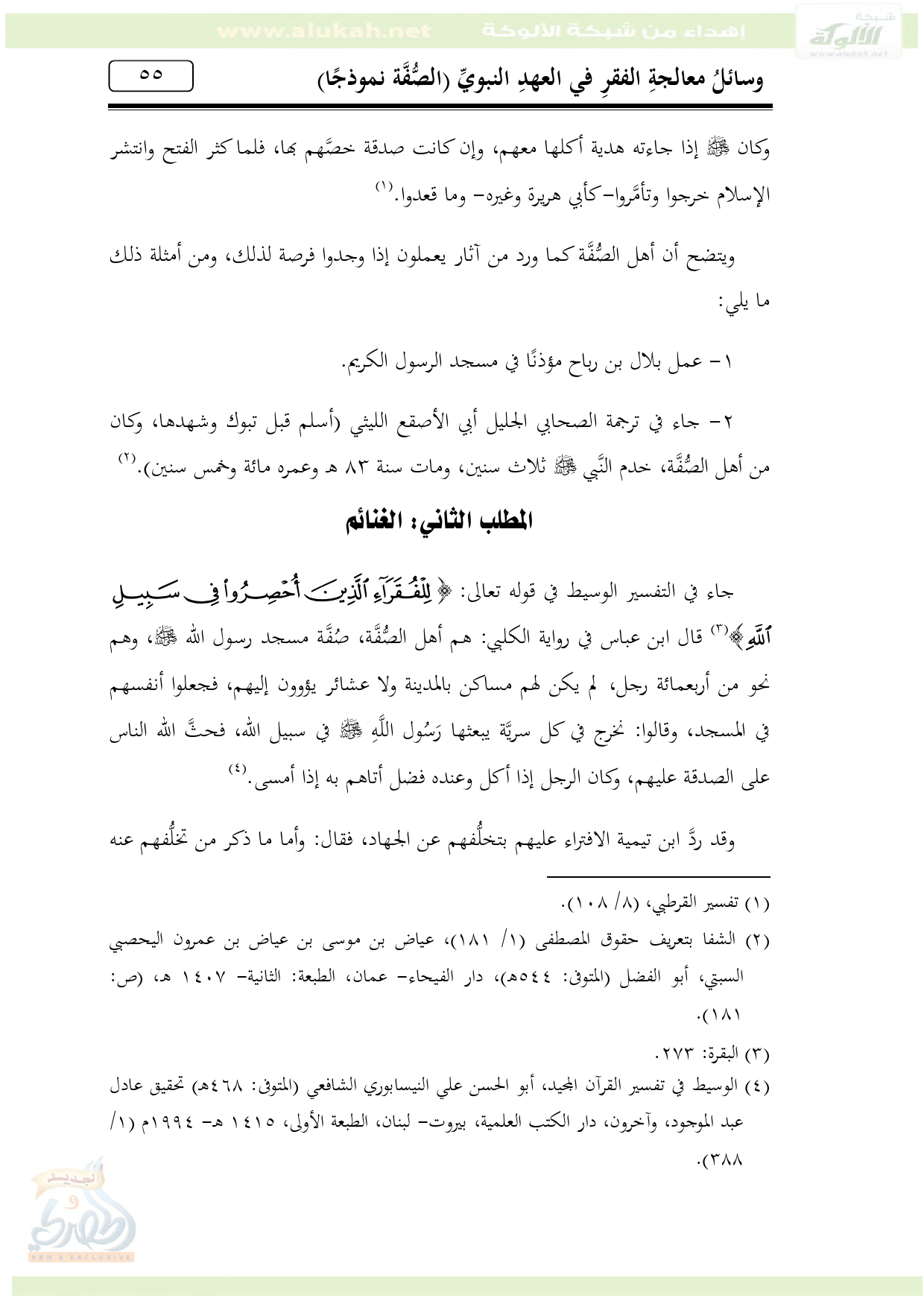 جاء في التفسير الوسيط في قوله تعالى: {لِلْفُقَرَاءِ الَّذِينَ أُحْصِرُوا فِي سَبِيلِ اللَّهِ} (¬3) قال ابن عباس في رواية الكلبي: هم أهل الصُّفَّة، صُفَّة مسجد رسول الله - صلى الله عليه وسلم -، وهم نحو من أربعمائة رجل، لم يكن لهم مساكن بالمدينة ولا عشائر يؤوون إليهم، فجعلوا أنفسهم في المسجد، وقالوا: نخرج في كل سريَّة يبعثها رَسُول اللَّهِ - صلى الله عليه وسلم - في سبيل الله، فحثَّ الله الناس على الصدقة عليهم، وكان الرجل إذا أكل وعنده فضل أتاهم به إذا أمسى. (¬4)