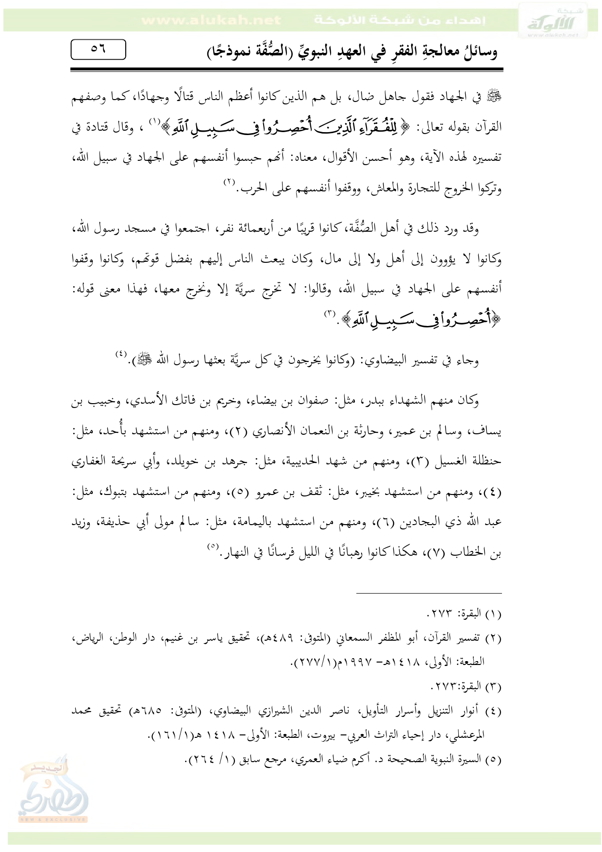 - صلى الله عليه وسلم - في الجهاد فقول جاهل ضال، بل هم الذين كانوا أعظم الناس قتالًا وجهادًا، كما وصفهم القرآن بقوله تعالى: {لِلْفُقَرَاءِ الَّذِينَ أُحْصِرُوا فِي سَبِيلِ اللَّهِ} (¬1)، وقال قتادة في تفسيره لهذه الآية، وهو أحسن الأقوال، معناه: أنهم حبسوا أنفسهم على الجهاد في سبيل الله، وتركوا الخروج للتجارة والمعاش، ووقفوا أنفسهم على الحرب. (¬2)