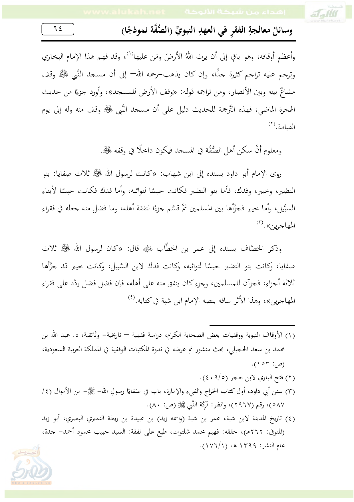 (¬1) الأوقاف النبوية ووقفيات بعض الصحابة الكرام، دراسة فقهية - تاريخية- وثائقية، د. عبد الله بن محمد بن سعد الحجيلي، بحث منشور تم عرضه في ندوة المكتبات الوقفية في المملكة العربية السعودية، (ص: 153).