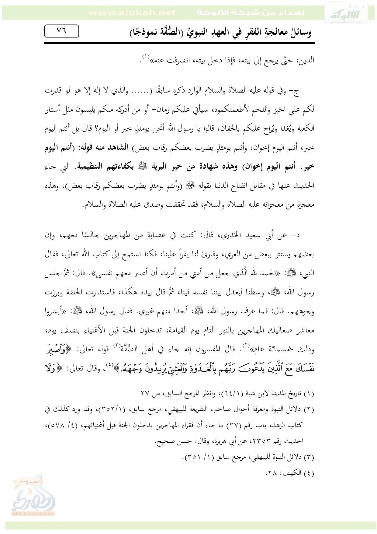 د- عن أبي سعيد الخدري، قال: كنت في عصابة من المهاجرين جالسًا معهم، وإن بعضهم يستتر ببعض من العري، وقارئ لنا يقرأ علينا، فكنا نستمع إلى كتاب الله تعالى، فقال النبي، - صلى الله عليه وسلم -: «الحمد لله الَّذي جعل من أمتي من أمرت أن أصبر معهم نفسي». قال: ثمَّ جلس رسول الله، - صلى الله عليه وسلم -، وسطنا ليعدل بيننا نفسه فينا، ثمَّ قال بيده هكذا، فاستدارت الحلقة وبرزت وجوههم. قال: فما عرف رسول الله، - صلى الله عليه وسلم -، أحدا منهم غيري. فقال رسول الله، - صلى الله عليه وسلم -: «أبشروا معاشر صعاليك المهاجرين بالنور التام يوم القيامة، تدخلون الجنة قبل الأغنياء بنصف يوم، وذلك خمسمائة عام» (¬2). قال المفسرون إنه جاء في أهل الصُّفَّة (¬3) قوله تعالى: {وَاصْبِرْ نَفْسَكَ مَعَ الَّذِينَ يَدْعُونَ رَبَّهُمْ بِالْغَدَاةِ وَالْعَشِيِّ يُرِيدُونَ وَجْهَهُ} (¬4)، وقال تعالى: {وَلَا
