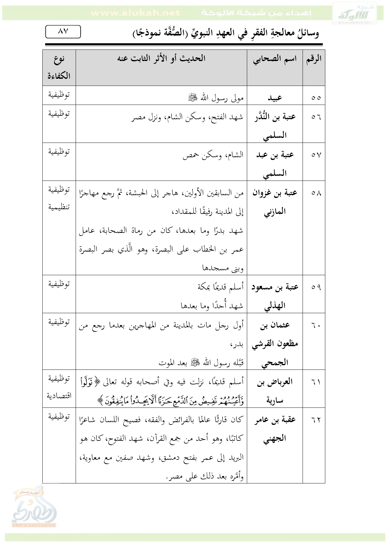 61 ... العرباض بن سارية ... أسلم قديمًا، نزلت فيه وفي أصحابه قوله تعالى {تَوَلَّوْا وَأَعْيُنُهُمْ تَفِيضُ مِنَ الدَّمْعِ حَزَنًا أَلَّا يَجِدُوا مَا يُنْفِقُونَ} ... توظيفية ... اقتصادية