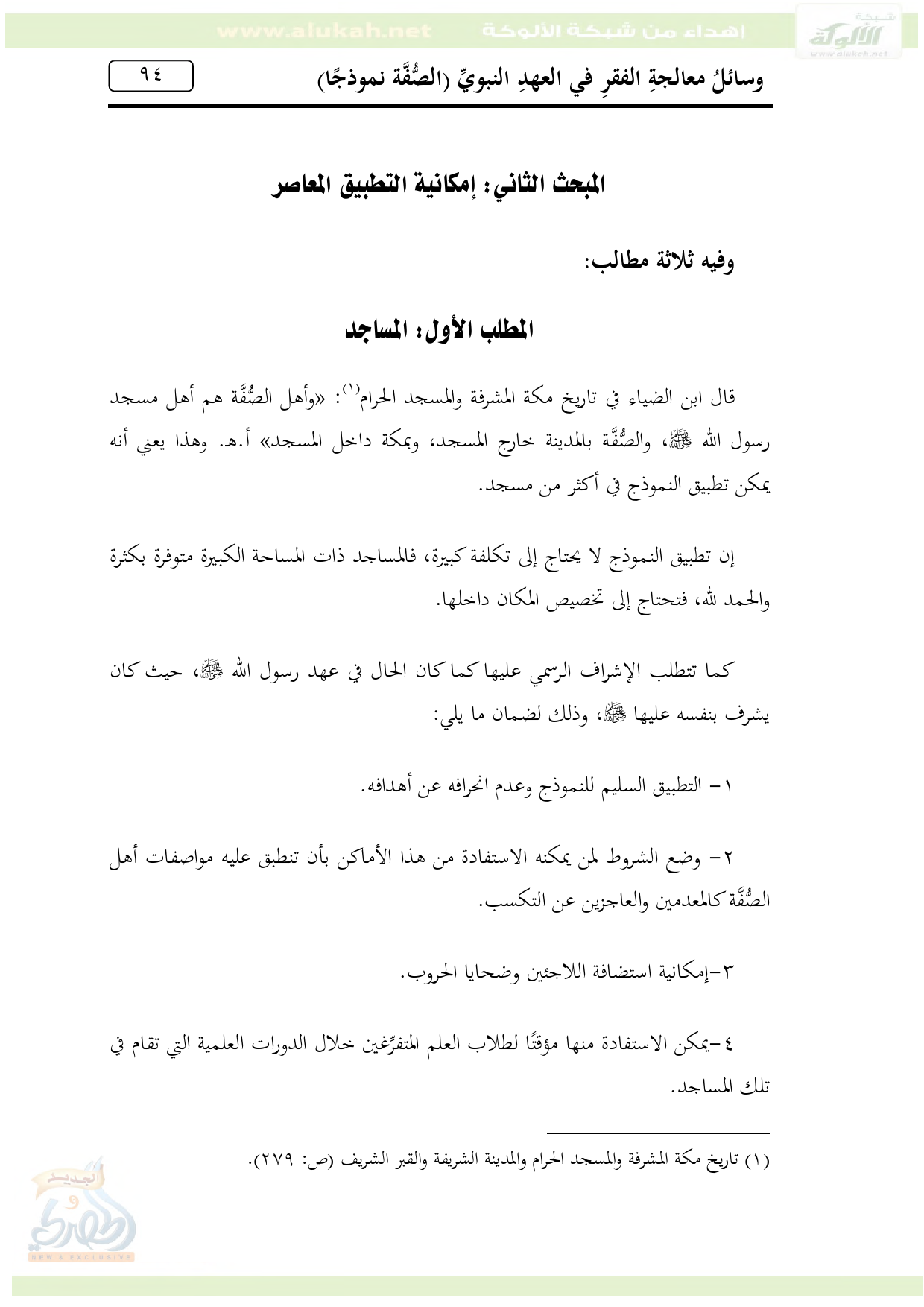 قال ابن الضياء في تاريخ مكة المشرفة والمسجد الحرام (¬1): «وأهل الصُّفَّة هم أهل مسجد رسول الله - صلى الله عليه وسلم -، والصُّفَّة بالمدينة خارج المسجد، وبمكة داخل المسجد» أ. هـ. وهذا يعني أنه يمكن تطبيق النموذج في أكثر من مسجد.