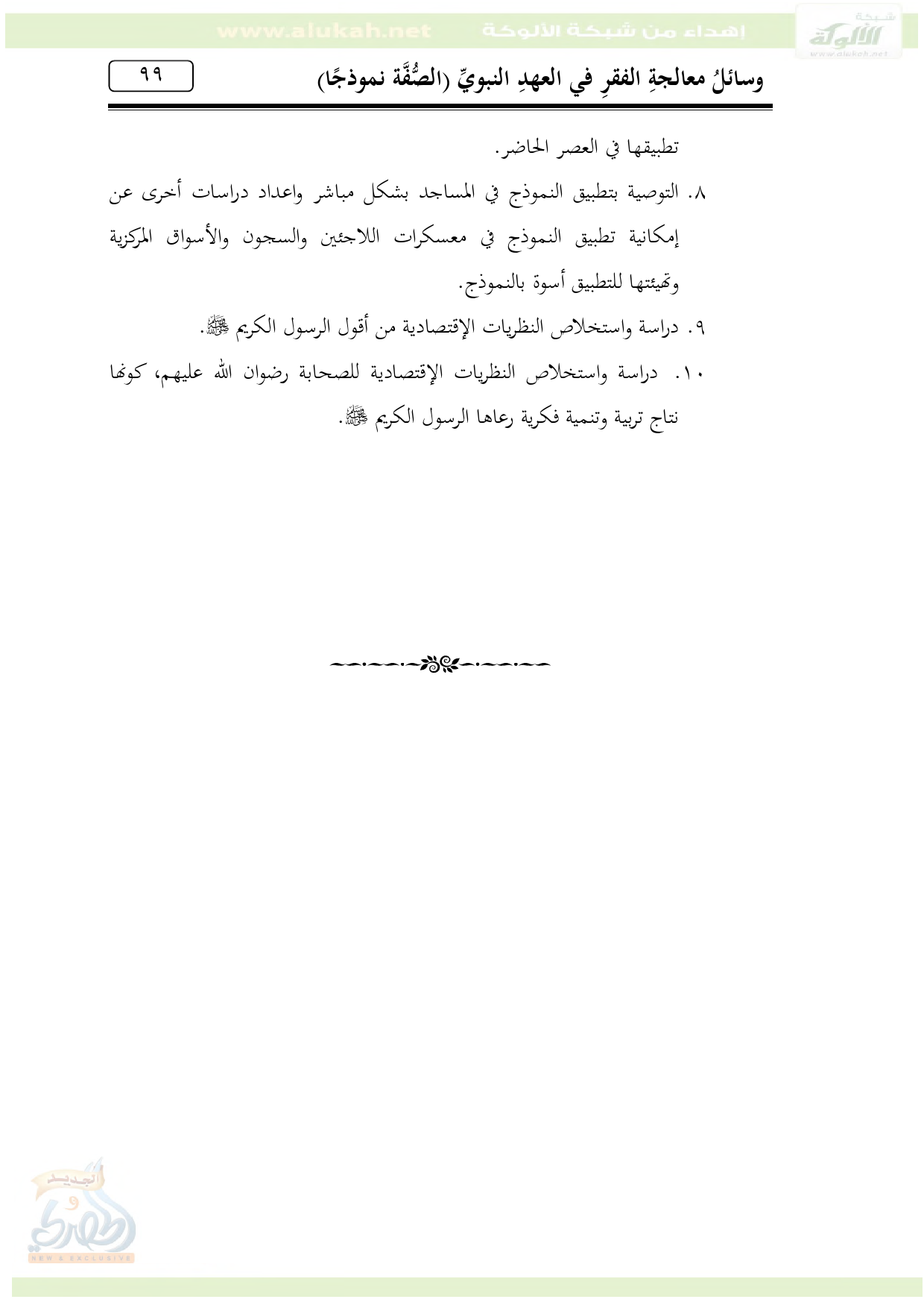 10. دراسة واستخلاص النظريات الإقتصادية للصحابة رضوان الله عليهم، كونها نتاج تربية وتنمية فكرية رعاها الرسول الكريم - صلى الله عليه وسلم -.