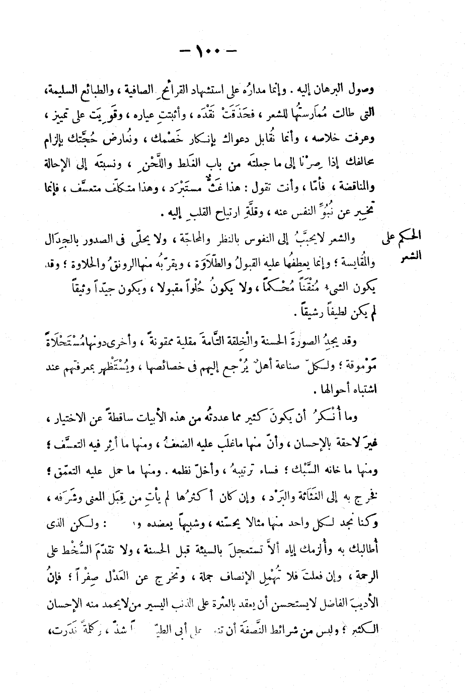 وصول البرهان إليه. وإنما مدارُه على استشهاد القرائح الصافية، والطبائع السليمة، التي طالت مُمارستُها للشعر، فحذقَت نقدَه، وأثبتت عياره، وقوِيت على تمييز، وعرفت خلاصه، وأنما نُقابل دعواك بإنكار خصْمك، ونُعارض حُجّتك بإلزام مخالفك إذا صِرنا الى ما جعلتَه من باب الغَلط واللّحْن، ونسبتَه الى الإحالة والمناقضة، فأما، وأنت تقول: هذا غثٌ مستبرَد، وهذا متكلّف متعسّف، فإنما تخبِر عن نُبوِّ النفس عنه، وقلّة ارتياح القلب إليه.