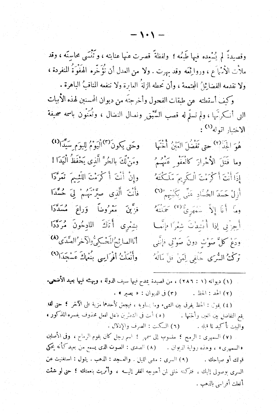وقصيدةً لم يُسعِده فيها طبعُه؛ ولفظةً قصرت عنها عنايته، وتنسى محاسنَه، وقد ملأت الأسْماع، وروائعه وقد بهرت. ولا من العدل أن تؤخره الهفوةُ المنفردة، ولا تقدمه الفضائل المجتمعة، وأن تحطه الزلةُ العابرة، ولا تنفعه المناقبُ الباهرة.