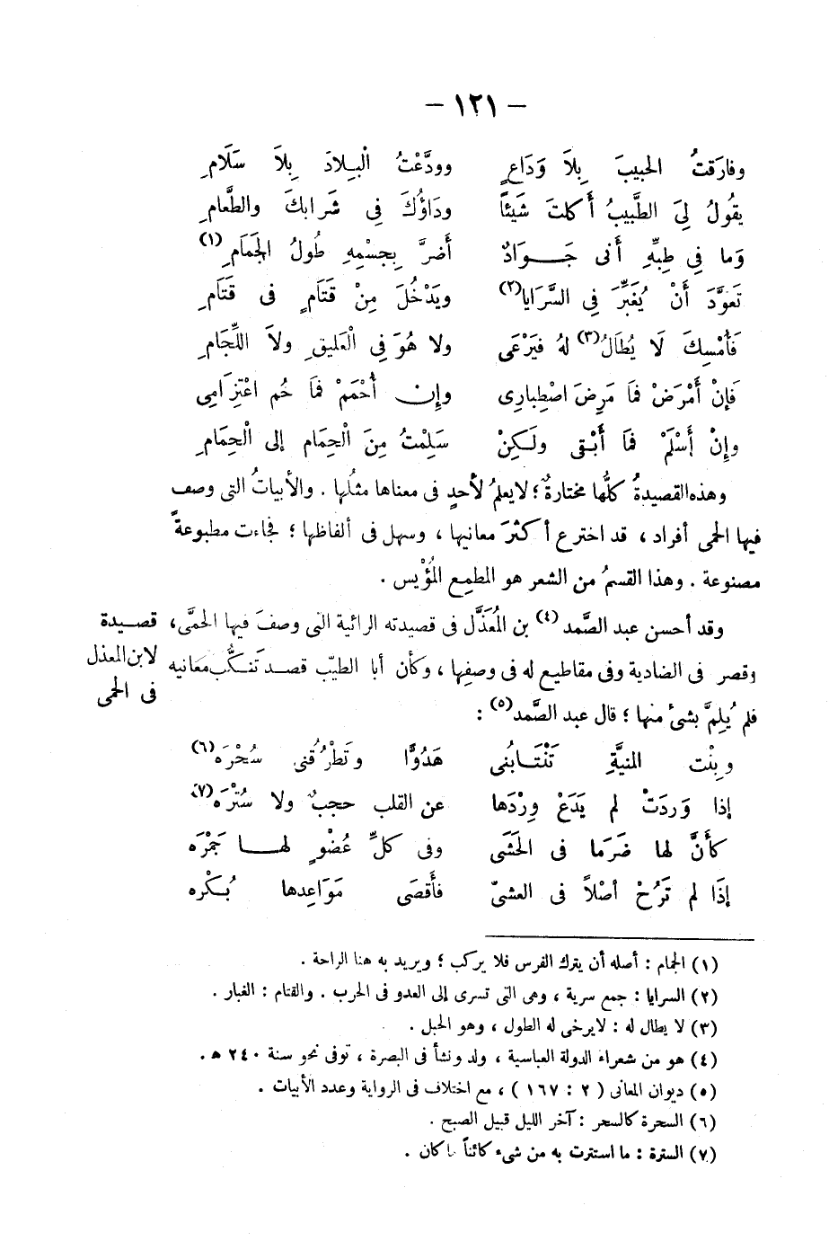 وهذه القصيدة كلّها مختارة؛ لا يعلمُ لأحدٍ في معناها مثلُه. والأبياتُ التي وصف فيها الحمى أفراد، وقد اخترع أكثر معانيها، وسهل في ألفاظها؛ فجاءت مطبوعةً مصنوعة. وهذا القسمُ من الشعر هو المطمِع المؤيس.