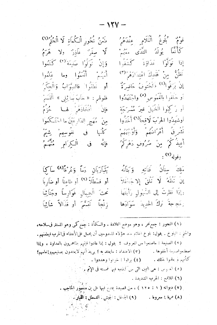 قومٌ بُلوغُ الغُلام عندَهُمُ ... طعْنُ نُحورِ الكُماة لا الحُلُمُ