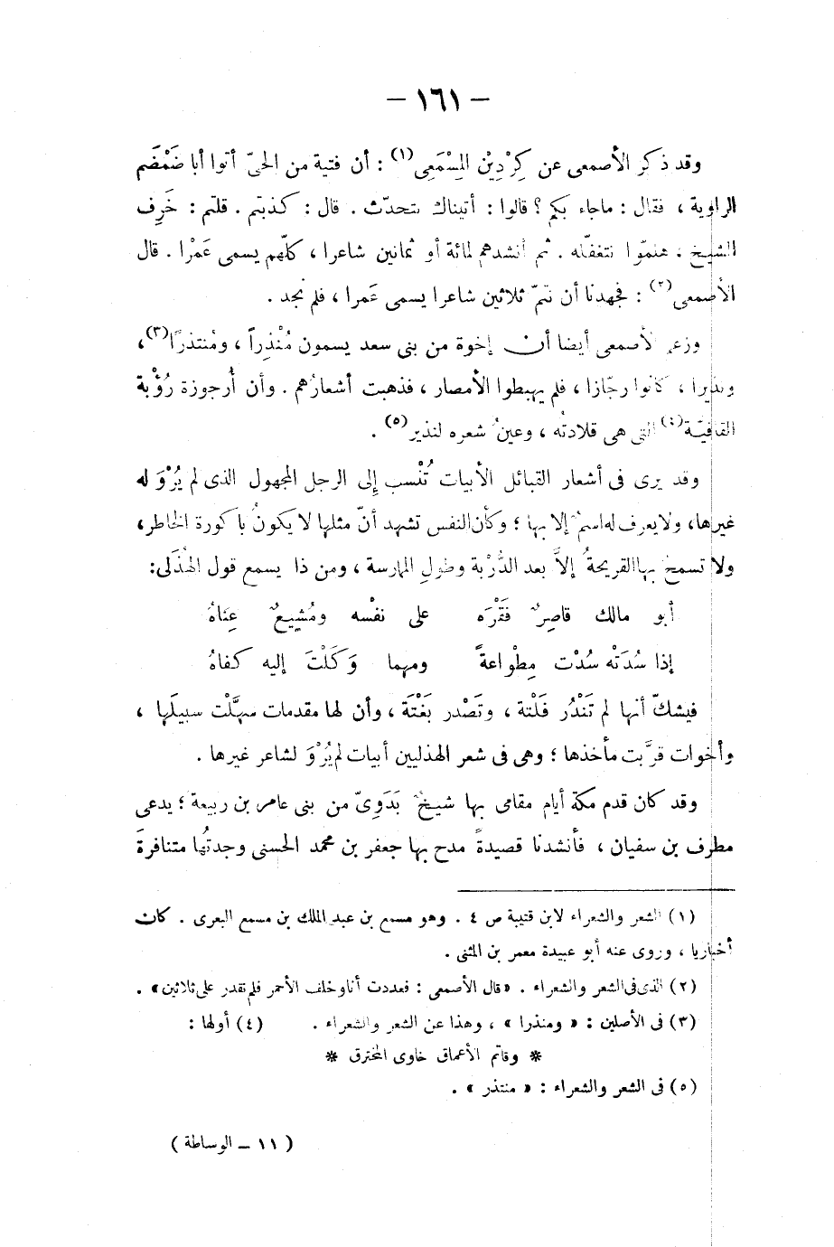 وزعم الأصمعي أيضاً أن إخوة من بني سعد يسمون مُنذِراً، ومُنتذراً، ونذيراً، كانوا رجّازاً، فلم يهبطوا الأمصار، فذهبت أشعارُهم. وأن أُرجوزة رؤْبة القافيّة التي هي قلادتُه، وعينُ شعره لنذير.