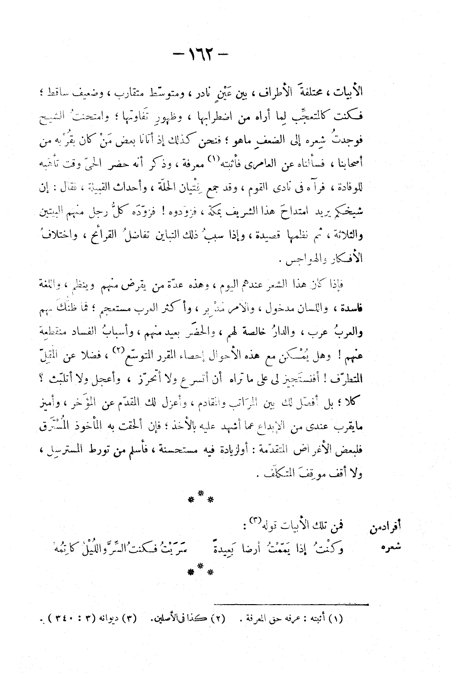 الأبيات، مختلفةَ الأطراف، بين عيْنٍ نادر، ومتوسّط متقارب، وضعيف ساقط؛ فكنت كالمتعجِّب لما أراه من اضطرابها، وظهورِ تفاوتها؛ وامتحنتُ الشيخ فوجدتُ شعره الى الضعف ما هو؛ فنحن كذلك إذ أتانا بعض مَنْ كان بقُرْبه من أصحابنا، فسألناه عن العامري فأثبته معرفة، وذكر أنه حضر الحيّ وقت تأهبه للوفادة، فرآه في نادي القوم، وقد جمع فِتْيان الحلّة، وأحداث القبيلة، فقال: إن شيخكم يريد امتداحَ هذا الشريف بمكة، فزوّدوه! فزوّدَه كلّ رجل منهم البيتين والثلاثة، ثم نظمها قصيدة، وإذا سببُ ذلك التباين تفاضلُ القرائح، واختلافُ الأفكار والهواجس.