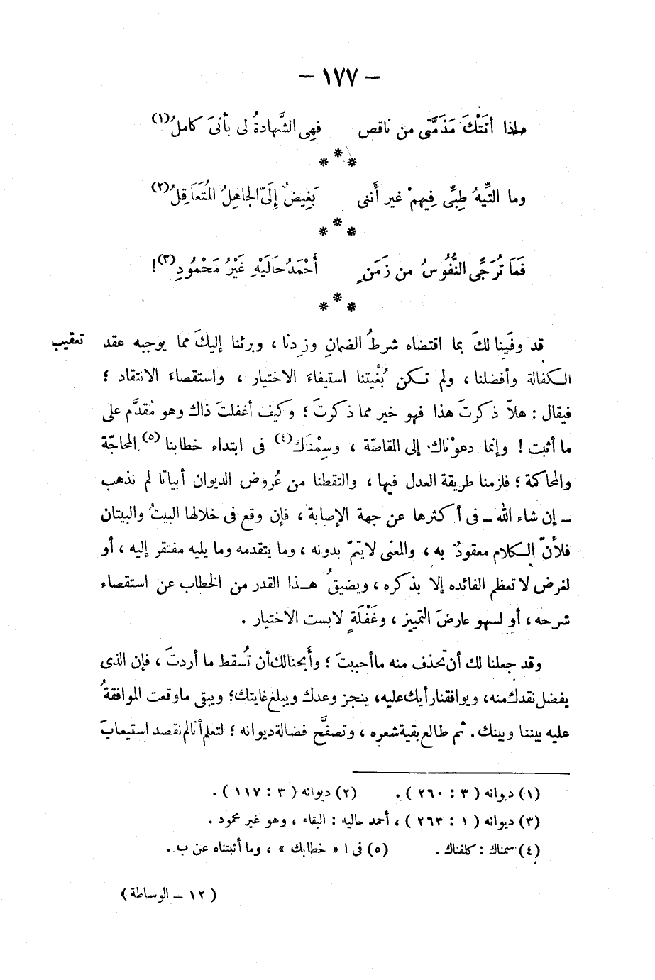 وقد وَفينا لك بما اقتضاه شرطُ الضمان وزدنا، وبرئنا إليكَ مما يوجبه عقد الكفالة وأفضلنا، ولم تكن بُغيتنا استيفاءَ الاختيار، واستقصاءَ الانتقاد؛ فيقال: هلا ذكرتَ هذا فهو خير مما ذكرت؛ وكيف أغفلتَ ذاك وهو مقدَّم على ما أثبت! وإنما دعوناك الى المقاصّة، وسِمْناك في ابتداء خطابنا المحاجّة والمحاكمة؛ فلزمنا طريقة العدل فيها، والتقطنا من عُروض الديوان أبياتاً لم نذهب - إن شاء الله - في أكثرها عن جهة الإصابة، فإن وقع في خلاله البيتُ والبيتان فلأنّ الكلام معقود به، والمعنى لا يتمّ بدونه، وما يتقدمه وما يليه مفتقر إليه، أو لغرض لا تعظم الفائدة إلا بذكره، ويضيقُ هذا القدر من الخطاب عن استقصاء شرحه، أو لسهو عارضَ التمييز، وغفْلةٍ لابست الاختيار.