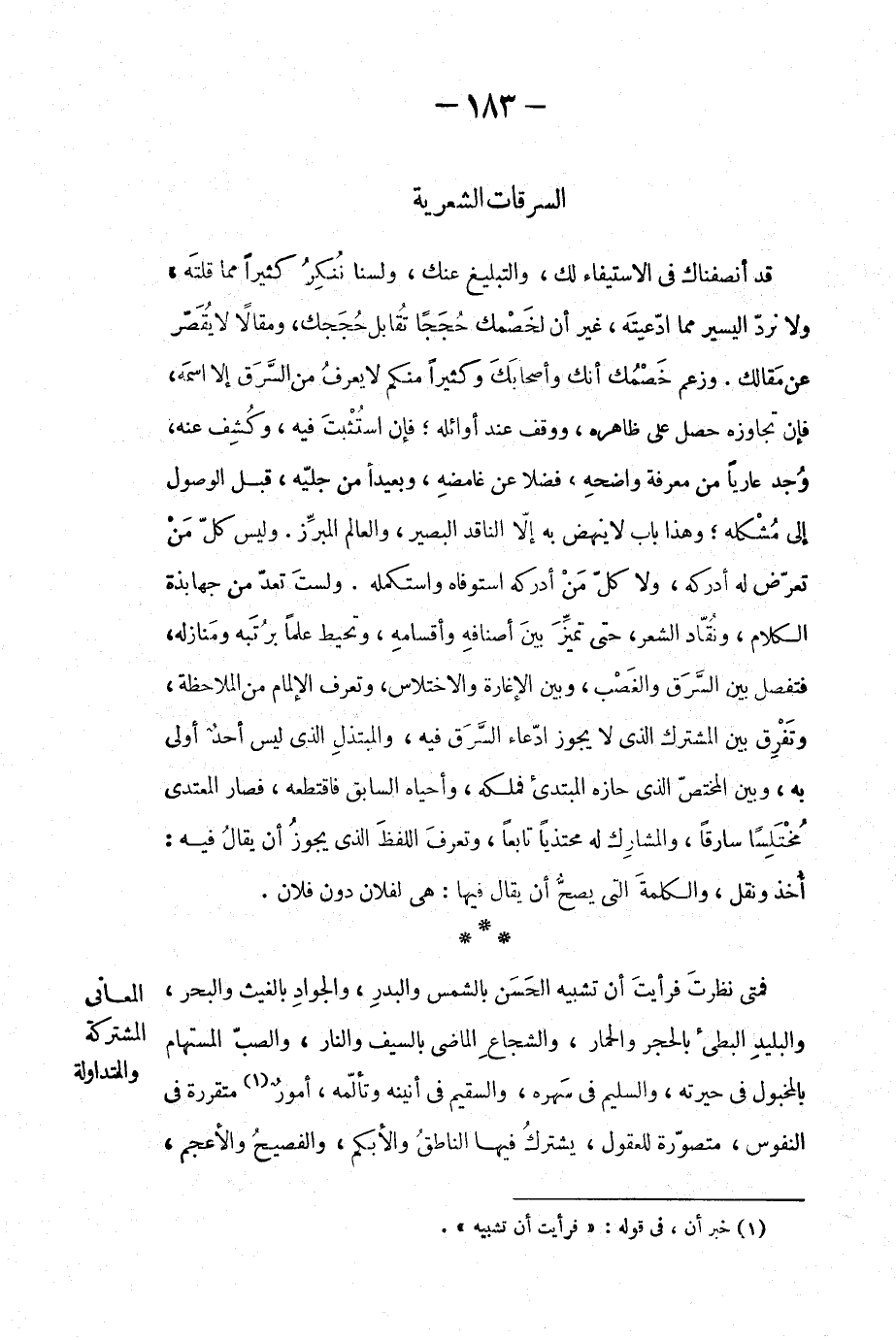 قد أنصفناك في الاستيفاءلك، والتبليغ عنك، ولسنا نُنكِر كثيراً مما قلتَه، ولا نردّ اليسير مما ادّعيته، غير أن لخصمك حُجَجاً تُقابل حُجَجك، ومقالاً لا يقصّر عن مقالك. وزعم خصمُك أنك وأصحابك وكثيراً منكم لا يعرف من السَّرَق إلا اسمَه، فإن تجاوزه حصل على ظاهره، ووقف عند أوائله؛ فإن استُثبتَ فيه، وكُشِف عنه، وُجد عارياً من معرفة واضحهِ، فضلاً عن غامضه، وبعيداً من جليه، قبل الوصول الى مُشكله؛ وهذا باب لا ينهض به إلا الناقد البصير، والعالم المبرِّز. وليس كل من تعرّض له أدركه استوفاه واستكمله. ولستَ تعدّ من جهابذة الكلام، ونُقّاد الشعر، حتى تميّز بين أصنافه وأقسامِه، وتحيط علماً برُتَبه ومنازله، فتفصل بين السرق والغصْب، وبين الإغارة والاختلاس، وتعرف الإلمام من الملاحظة، وتفرِق بين المشترك الذي لا يجوز ادّعاء السّرَق فيه، والمبتذل الذي ليس أحدٌ أولى به، وبين المختصّ الذي حازه المبتدئ فملكه، وأحياه السابق فاقتطعه، فصار المعتدي مُختلساً سارقاً، والمشارِك له محتذياً تابعاً، وتعرف اللفظ الذي يجوز أن يقال فيه: أُخذ ونقل، والكلمة التي يصح أن يقال فيها: هي لفلان دون فلان.
