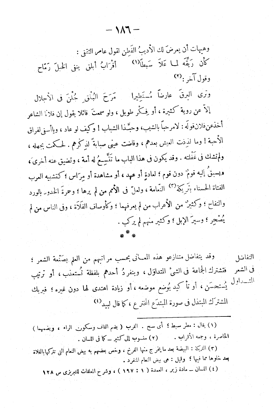 وقد يتفاضل متنازعو هذه المعاني بحسب مراتبهم من العلم بصنعة الشعر؛ فتشترك الجماعة في الشيء المتداوَل، وينفردُ أحدهم بلفظة تُستعذب، أو ترتيب يُستحسَن، أو تأكد يوضع موضعه، أو زيادة اهتدى لها دون غيره؛ فيريك المشترَك المبتذل في صورة المبتدَع المخترع، كما قال لبيد: