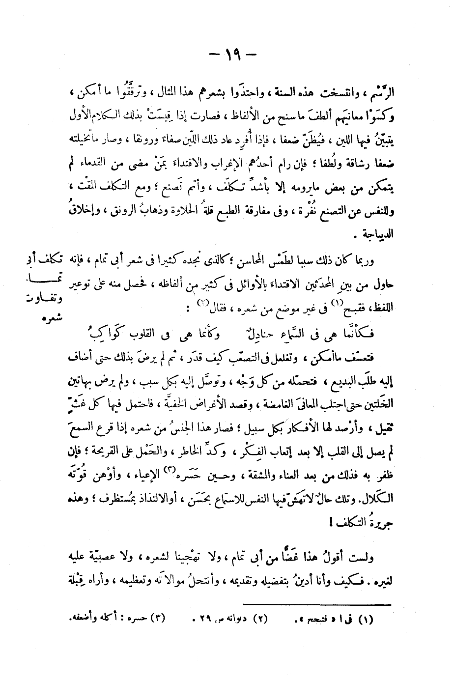 فتعسّف ما أمكن، وتغلغل في التصعّب كيف قدر، ثم لم يرضَ بذلك حتى أضاف إليه طلَب البديع، فتحمّله من كل وجْه، وتوصّل إليه بكل سبب، ولم يرض بهاتين الخَلتين حتى اجتلب المعاني الغامضة، وقصد الأغراض الخفيّة، فاحتمل فيها كل غثٍّ ثقيل، وأرْصد لها الأفكار بكل سبيل؛ فصار هذا الجنسُ من شعره إذا قرع السمعَ لم يصل الى القلب إلا بعد إتعاب الفِكْر، وكدّ الخاطر، والحَمْل على القريحة؛ فإن ظفر به فذلك من بعد العناء والمشقة، وحين حسَره الإعياء، وأوْهن قوّتَه الكَلال. وتلك حالٌ لا تهَشّ فيها النفس للاستماع بحسَن، أو الالتذاذُ بمُستظرف؛ وهذه جريرةُ التكلف! ولست أقول هذا غضّاً من أبي تمام، ولا تهْجيناً لشعره، ولا عصبيّة عليه لغيره. فكيف وأنا أدينُ بتفضيله وتقديمه، وأنتحلُ موالاتَه وتعظيمه، وأراه قِبْلة