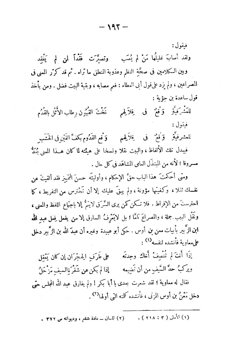 وبين الكلامين في صحّة النظم وعذوبة المنطق ما تراه. ثم قد كرر المعنى في المصراعين، ولم يزد على قول أبي العطاء: فعم مصابه، وبقية البيت فضل. ومن يأخذ قول ساعدة بن جؤية: