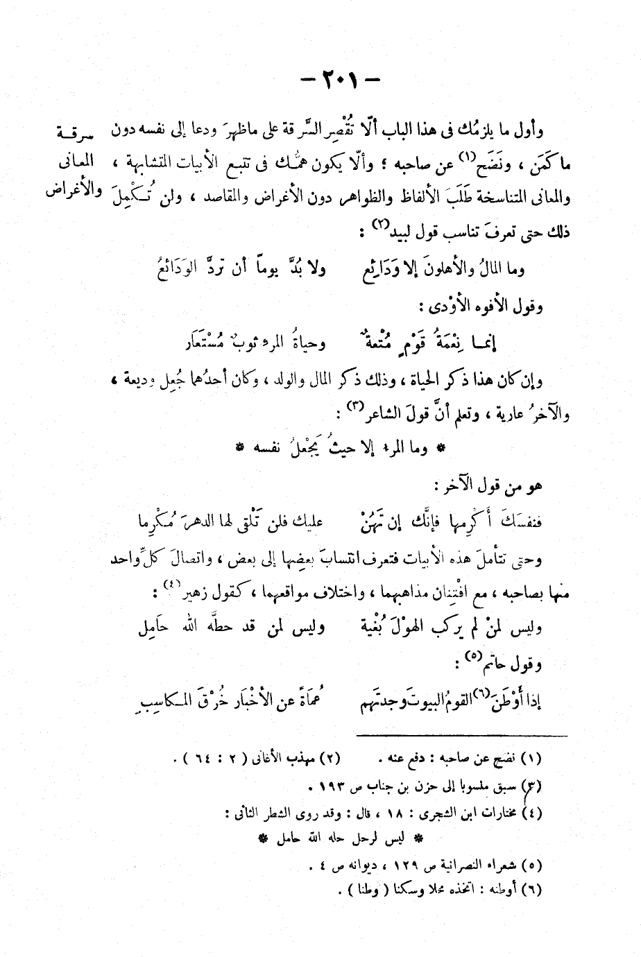 وأول ما يلزمُك في هذا الباب ألا تُقصِر السّرقة على ما ظهر ودعا الى نفسه دون ما كمَن، ونضح عن صاحبه؛ وألا يكون همّك في تتبّع الأبيات المتشابهة، والمعاني المتناسخة طلب الألفاظ والظواهر دون الأغراض والمقاصد، ولن تُكمِل ذلك حتى تعرفَ تناسب قول لبيد: