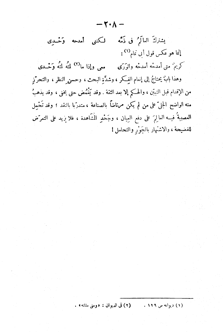 وهذا بابٌ يحتاج الى إنعام الفِكر، وشدّةِ البحث، وحسن النظر، والتحرّز من الإقدام قبل التبيّن، والحكم إلا بعد الثقة. وقد يغمُض حتى يخفى، وقد يذهب منه الواضح الجلي على من لم يكن مرتاضاً بالصناعة، متدرّبا بالنقد؛ وقد تحمِل العصبيةُ فيه العالِمَ على دفع العِيان، وجحْدِ المشاهدة، فلا يزيد على التعرّض للفضيحة، والاشتهار بالجَوْر والتحامل!