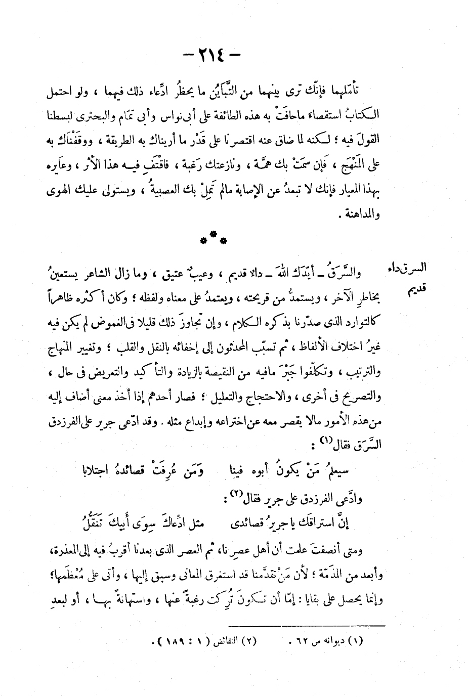 والسَّرَق - أيدك الله - داءٌ قديم، وعيبٌ عتيق، وما زال الشاعر يستعينُ بخاطرِ الآخر، ويستمدّ من قريحته، ويعتمدُ على معناه ولفظه؛ وكان أكثره ظاهراً كالتوارد الذي صدّرنا بذكره الكلام، وإن تجاوزَ ذلك قليلاً في الغموض لم يكن فيه غيرُ اختلاف الألفاظ، ثم تسبّب المحدثون الى إخفائه بالنقل والقلب؛ وتغيير المنهاج والترتيب، وتكلّفوا جبْرَ ما فيه من النقيصة بالزيادة والتأكيد والتعريض في حال، والتصريح في أخرى، والاحتجاج والتعليل؛ فصار أحدهم إذا أخذ معنى أضاف إليه من هذه الأمور ما لا يقصر معه عن اختراعه وإبداع مثله. وقد ادّعى جرير على الفرزدق السَّرَق فقال: