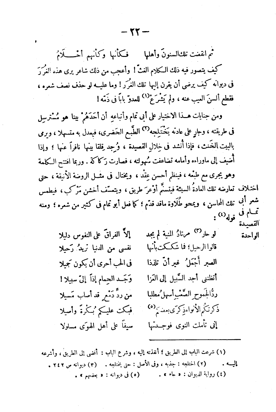 ومن جنايات هذا الاختيار على أبي تمام وأتباعِه أن أحدَهُم بينا هو مسترسِل في طريقته، وجارٍ على عادته يختلِجه الطّبع الحَضري، فيعدل به متسهلاً، ويرمي بالبيت الخَنث، فإذا أُنشد في خِلال القصيدة، وُجِد قلقاً بينها نافراً عنها؛ وإذا أُضيف الى ما وراءه وأمامه تضاعفت سُهولته، فصارت رَكاكة. وربما افتتح الكلمة وهو يجري مع طبْعه، فينظم أحسن عِقْد، ويختال في مثل الروضة الأنيقة، حتى تعارضه تلك العادةُ السيئة فيتسنّم أوْعرَ طريق، ويتعسّف أخشن مرْكب، فيطمس تلك المحاسن، ويمحو طُلاوة ما قد قدّم؛ كما فعل أبو تمام في كثير من شعره؛ ومنه قوله: