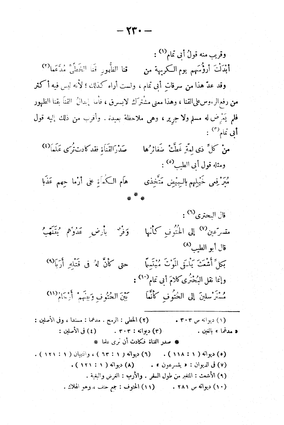 وقد عدّ هذا من سرقاتِ أبي تمام، ولست أراه كذلك؛ لأنه ليس فيه أكثر من رفع الرءوس على القنا، وهذا معنى مشترَك لا يسرق، فأما إبدالُ القَنا بقنا الظهور فلم يعرِض له مسلم ولا جرير، وهي ملاحظة بعيدة. وأقرب من ذلك إليه قول أبي تمام:
