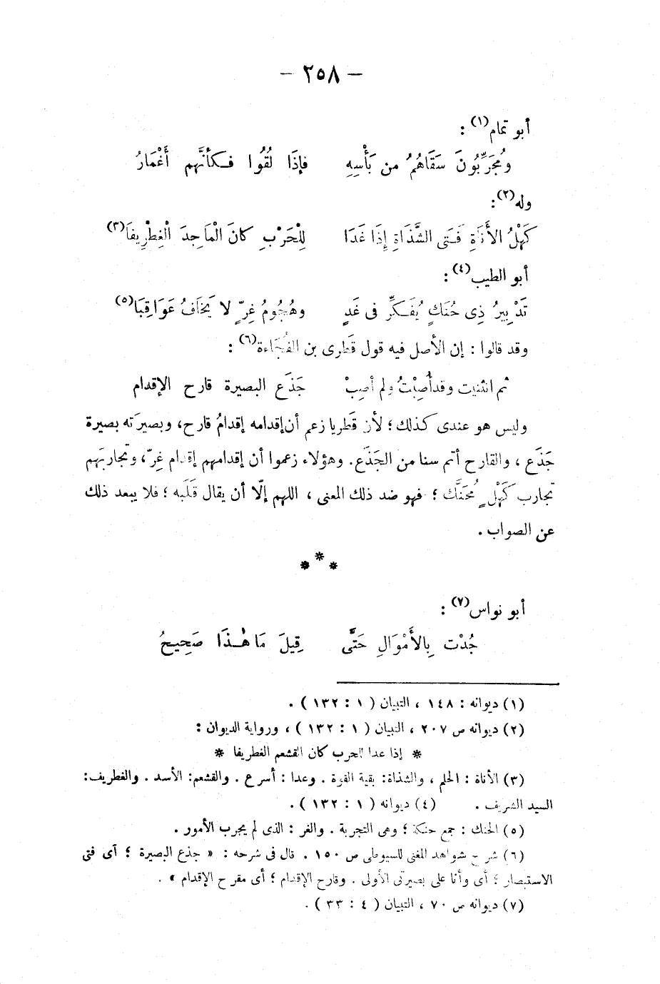 وليس هو عندي كذلك؛ لأن قطرياً زعم أن إقدام قارح، وبصيرَته بصيرة جذَع، والقارح أتم سناً من الجذع. وهؤلاء زعموا أن إقدامهم إقدام غِرّ، وتجاربهم تجارب كهلٍ محنّك؛ فهو ضد ذلك المعنى، اللهم إلا أن يُقال قلَبه؛ فلا يبعد ذلك عن الصواب.
